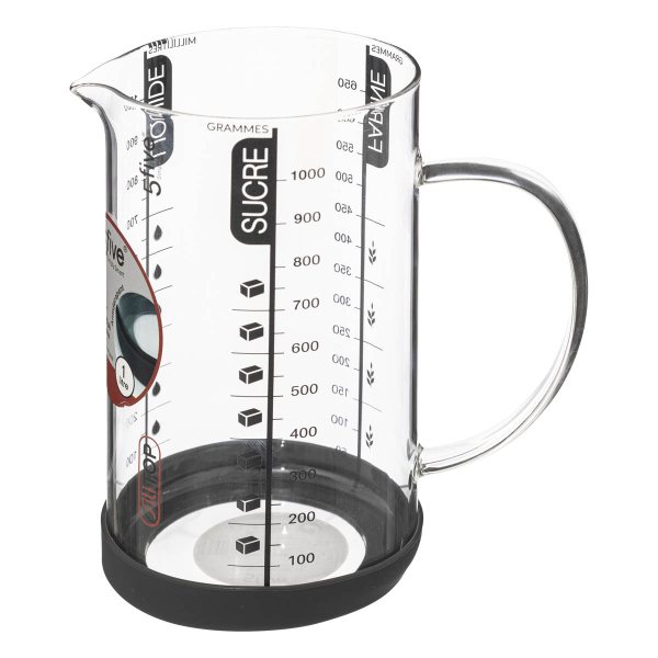 Δοσομετρητής κανάτα των 1000ml για να σας βοηθήσει στην μαγειρική σας. Η κανάτα μεζούρα είναι κατασκευασμένη από διάφανο γυαλί και σας δίνει την δυνατότητα να μετρήσετε σε γραμμάρια και ml.