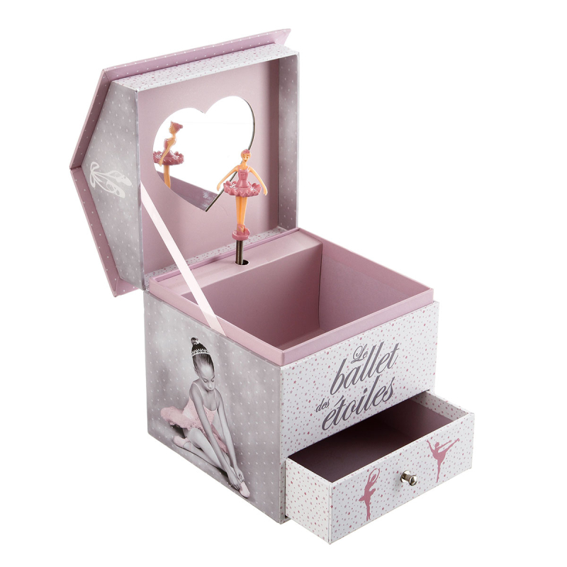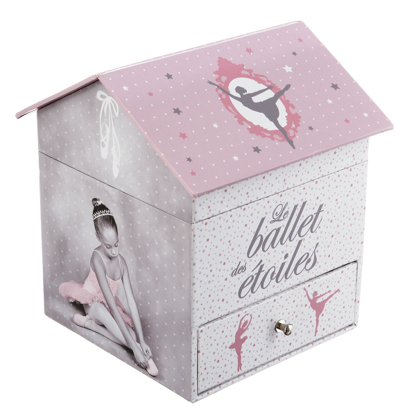 Μουσική μπιζουτιέρα με συρτάρι σε ροζ απόχρωση και σχέδιο σπιτάκι. Μόλις ανοίξετε το κουτί και γυρίσετε το κλειδάκι στην πίσω πλευρά, η μπαλαρίνα που διαθέτει θα ξεκινήσει να γυρνάει και θα ακουστεί μουσική. Είναι κατασκευασμένο από στιβαρό χαρτόνι και διαθέτει χώρο για την αποθήκευση μικροαντικειμένων όπως κοσμήματα, έχει επίσης καθρεφτάκι ενώ στο κάτω μέρος και ένα μικρό συρταράκι. Ιδανικό διακοσμητικό χώρου για να στολίσει το βρεφικό-παιδικό δωμάτιο.
