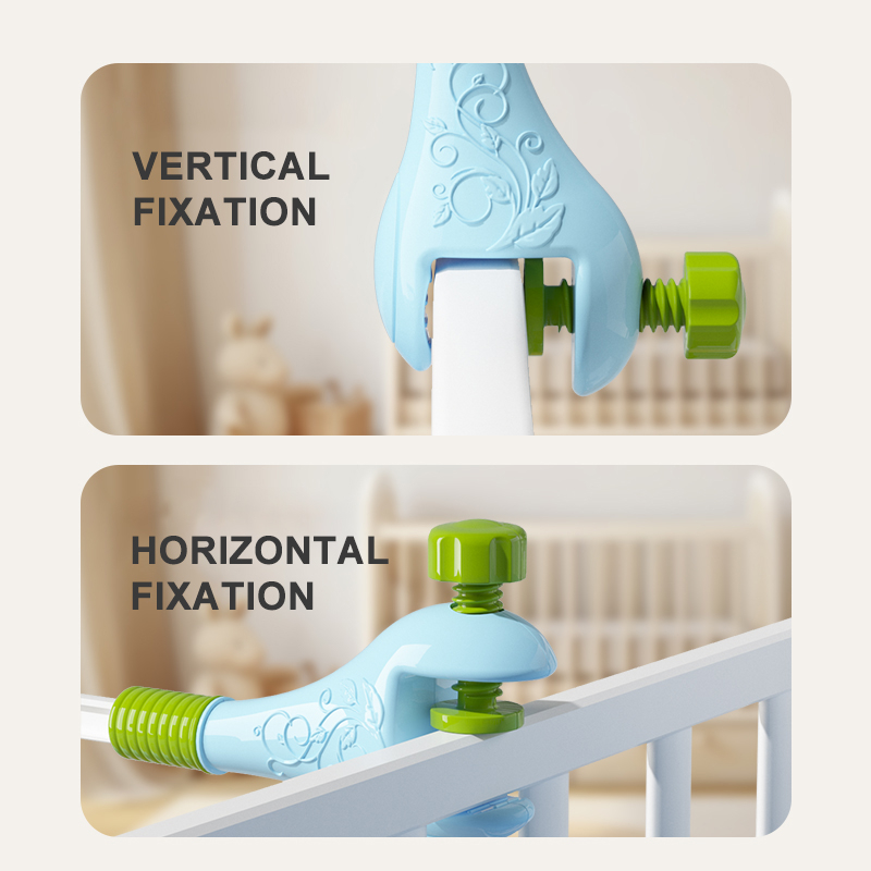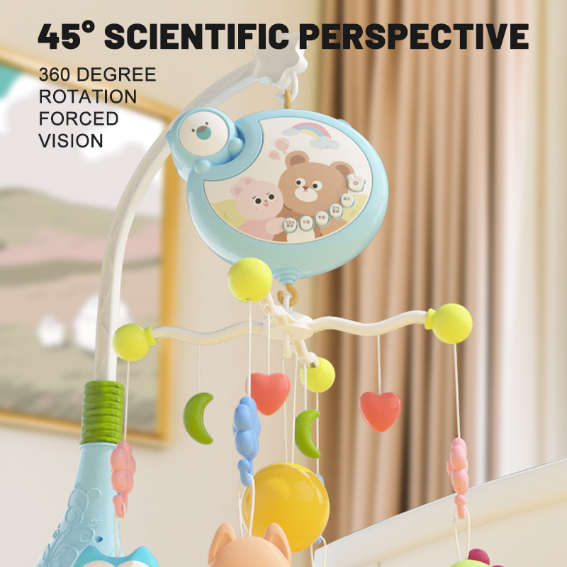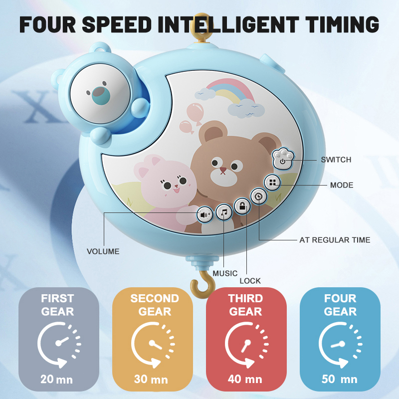 Μουσικό μόμπιλε σε γαλάζιο χρώμα, με πολύχρωμες λεπτομέρειες και σχέδιο ζωάκια από την εταιρεία Bebe Stars. Κατασκευασμένο από πλαστικό υλικό. Διαθέτει κρεμαστά παιχνιδάκια, απαλούς ήχους και γλυκά νανουρίσματα, δημιουργεί μια ήρεμη ατμόσφαιρα που βοηθά το μωρό να χαλαρώσει και να κοιμηθεί πιο εύκολα. Μπορεί να χρησιμοποιηθεί σε κρεβάτι, λίκνο ή παρκοκρέβατο και διαθέτει 4 υπέροχα αποσπώμενα κρεμαστά παιχνίδια (μασητικά και κουδουνίστρες) που περιστρέφονται 360°, τραβώντας την προσοχή του μωρού και ενισχύοντας τις αισθήσεις του. Η περιστροφή ρυθμίζεται σε 4 επίπεδα ταχύτητας, προσφέροντας προσαρμογή ανάλογα με τις ανάγκες του παιδιού. Ο ενσωματωμένος προβολέας προσφέρει φωτεινή προβολή φιλική προς τα μάτια, ενώ η συσκευή είναι αποσπώμενη και μπορεί να χρησιμοποιηθεί και αυτόνομα. Η βάση τοποθετείται εύκολα με δύο τρόπους, οριζόντια ή κάθετα, για μεγαλύτερη ευελιξία. Λειτουργεί με 3 μπαταρίες AAA (δεν περιλαμβάνονται). Κατάλληλο για βρέφη 0+ μηνών και πιστοποιημένο σύμφωνα με τα ευρωπαϊκά πρότυπα ασφαλείας EN71 και CE.