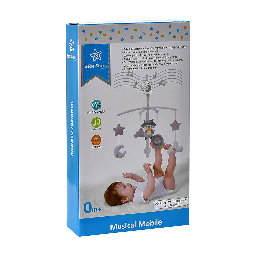 Μουσικό περιστρεφόμενο μόμπιλε από την εταιρεία Bebe Stars σε λευκό χρώμα με πολύχρωμες λεπτομέρειες. Ιδανικό για να απασχολεί το μωρό σας και να το διασκεδάζει με τους ήχους και τα χαριτωμένα παιχνιδάκια όταν βρίσκεται ξαπλωμένο στη κούνια του. Τα γλυκά νανουρίσματα, φέρνουν την ηρεμία και βοηθούν το μωρό σας να κοιμηθεί εύκολα. Μπορεί να χρησιμοποιηθεί σε κούνια, λίκνο ή παρκοκρέβατο. Με 5 κρεμαστά παιχνίδια από μαλακό βελουτέ ύφασμα υψηλής ποιότητας. Κατασκευασμένο σύμφωνα με τις Ευρωπαϊκές προδιαγραφές ΕΝ71 και με πιστοποίηση CΕ από 100% ασφαλή υλικά. Δεν χρει'αζεται μπαταρίες καθώς είναι κουρδιστό. Κατάλληλο από την γέννηση.