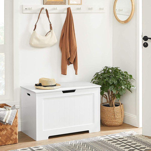 Μπαούλο αποθήκευσης μεγάλο σε λευκό χρώμα και μοντέρνο σχεδιασμό από την εταιρεία Vasagle. Είναι κατασκευασμένο από MDF ξύλο και έχει μέγιστο βάρος αντοχής έως 180kg. Διαθέτει εγκοπές στο πλάι για εύκολο κράτημα. Ιδανικό για όλους τους χώρους του σπιτιού ακόμα και για το βρεφικό-παιδικό δωμάτιο. *Το προϊόν έρχεται αμοντάριστο.*