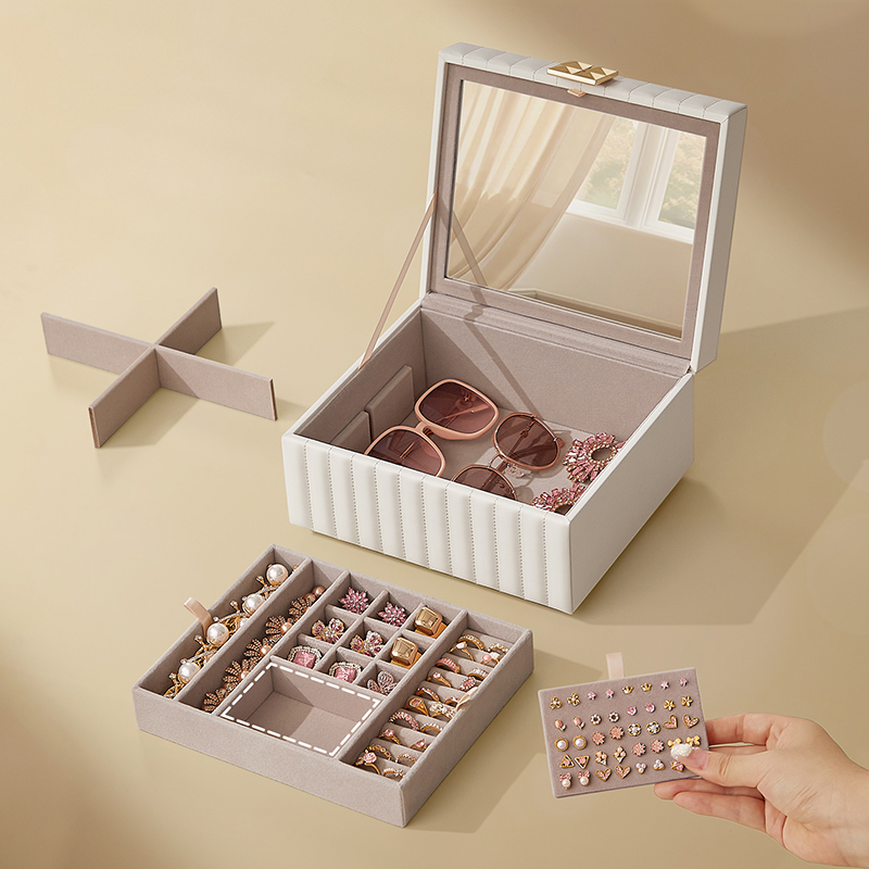 Θήκη κοσμημάτων με μοντέρνο σχεδιασμό από την εταιρεία Songmics. Ο σκελετός είναι κατασκευασμένος από ξύλο MDF και είναι ντυμένος με λευκό συνθετικό δέρμα ενώ το εσωτερικό είναι μπεζ βελούδο. Διαθέτει καθρέφτη για να μπορείτε να κοιτάζεστε όταν δοκιμάζετε τα μπιζού σας. Πίσω από τον καθρέφτη υπάρχει επιπλέον χώρος για να κρεμάτε τα κολιέ σας. Έχει 1 ανοιγόμενη θήκη η οποία έχει χωρίσματα που δημιουργούν χώρους κατάλληλους για σκουλαρίκια, δαχτυλίδια, κολιέ ή για ό,τι άλλο θέλετε. Μόλις σηκώσετε την επάνω θήκη αποκαλύπτετε 1 ακόμα θήκη με 4 χώρους. Τα χωρίσματα μπορούν να αφαιρεθούν για να δημιουργήσετε μια ενιαία θέση για μεγαλύτερα αξεσουάρ όπως γυαλιά ηλίου. Ιδανική μπιζουτιέρα για να κρατήσετε οργανωμένα τα κοσμήματα σας.