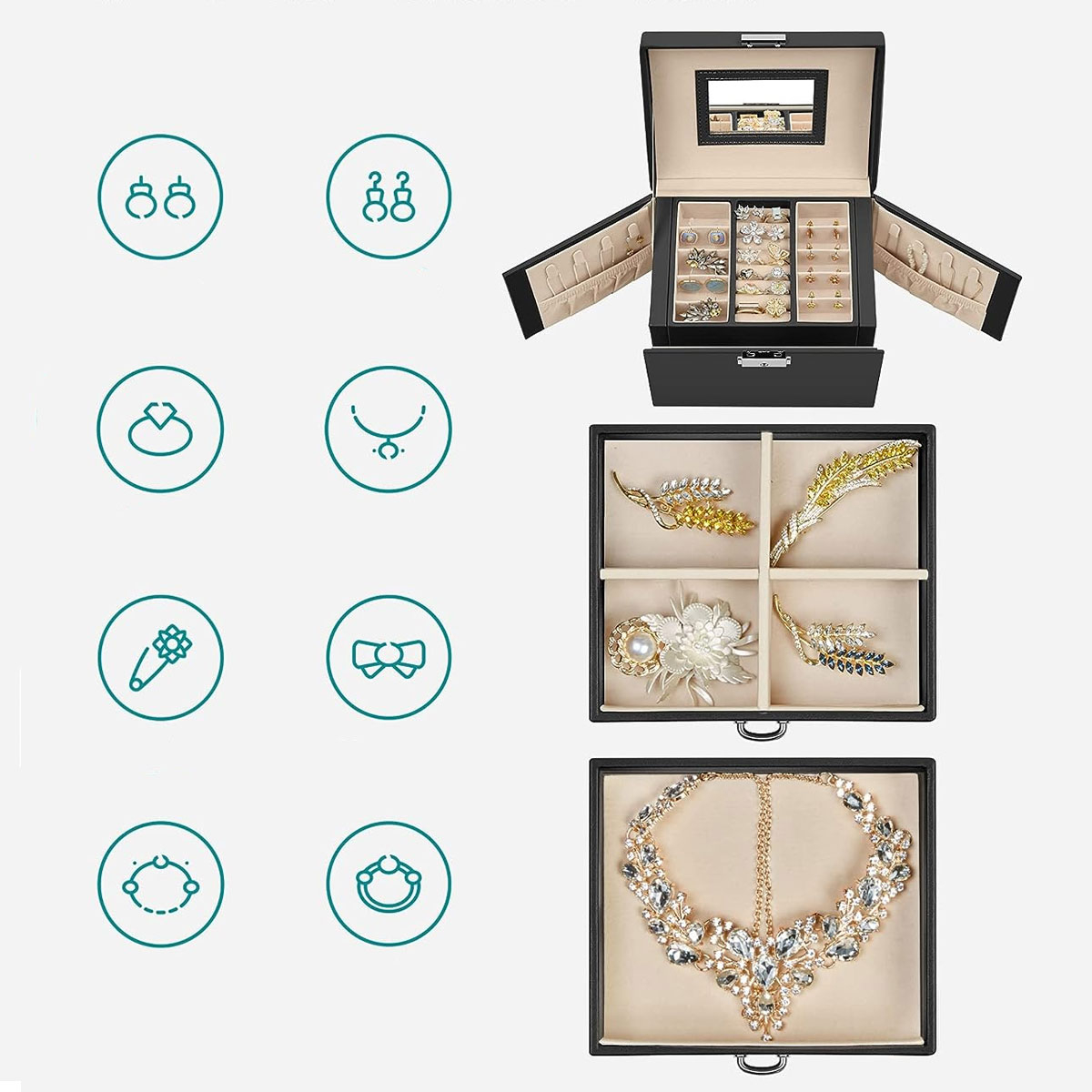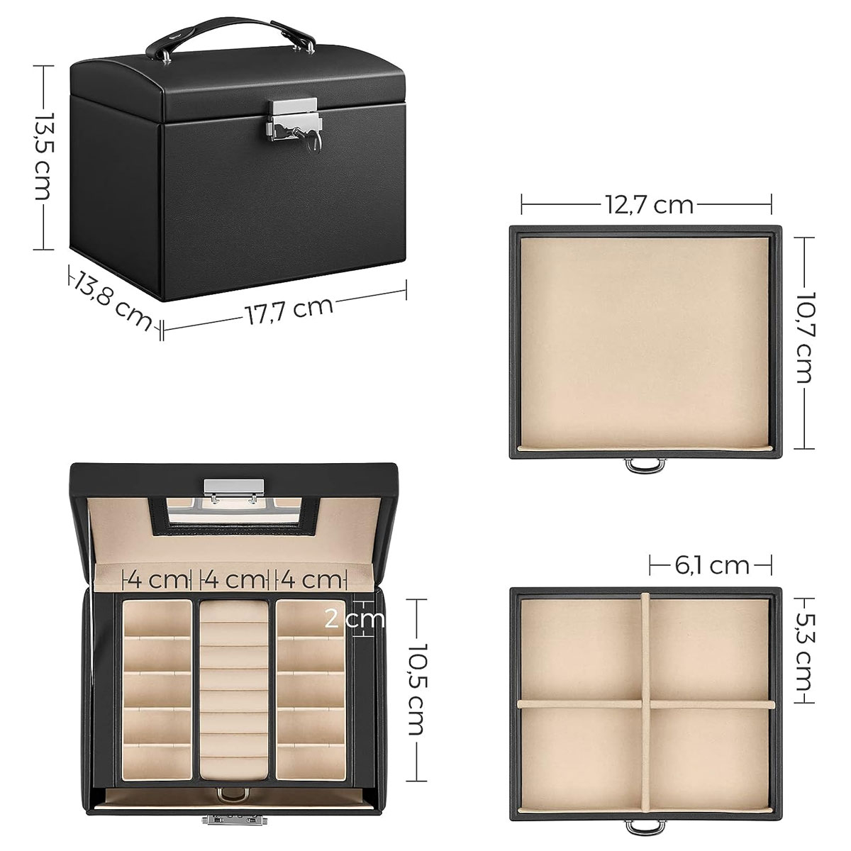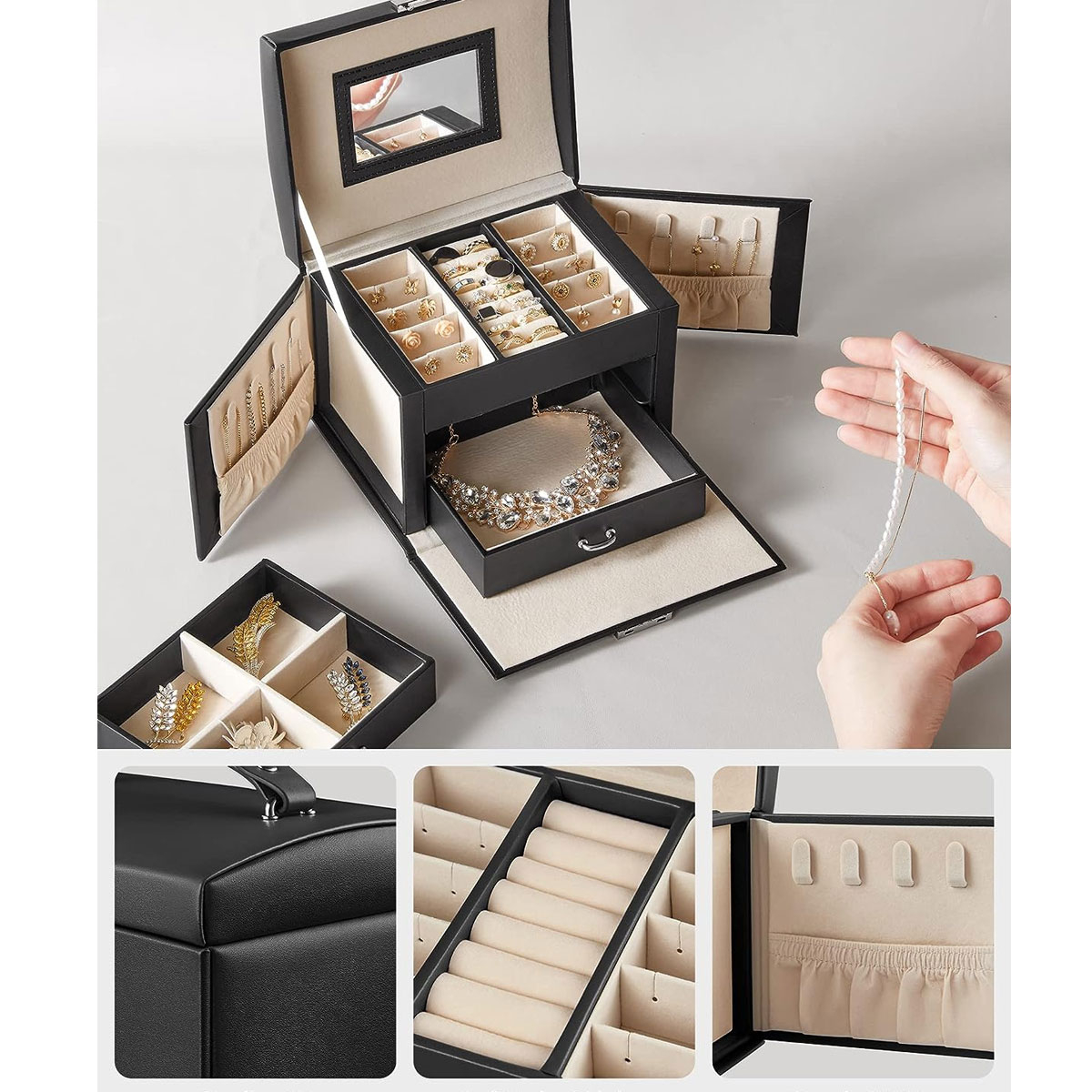 Θήκη κοσμημάτων με καθρέφτη και μοντέρνο σχεδιασμό από την εταιρεία Songmics. Ο σκελετός είναι κατασκευασμένος από ξύλο MDF και είναι ντυμένος με μαύρο συνθετικό δέρμα ενώ το εσωτερικό είναι μπεζ βελούδο. Έχει 1 ανοιγόμενη θήκη με χωρίσματα που δημιουργούν 10 μικρούς χώρους και 1 χώρο κατάλληλο για δαχτυλίδια. Διαθέτει 2 συρταράκια με λαβή ανοίγματος εκ των οποίων το 1 έχει χώρισμα εσωτερικά και δημιουργεί 2 χώρους. Στα πλαϊνά διαθέτει 2 ανοιγόμενες θήκες, κατάλληλες για να κρεμάτε τα κολιέ σας και να μην μπλέκονται. Κλείνει και μεταμορφώνεται σε βαλιτσάκι, ενώ σφραγίζει με κλιπ για εύκολη μεταφορά. Ιδανική μπιζουτιέρα για κολιέ, βραχιόλια, σκουλαρίκια και δαχτυλίδια.