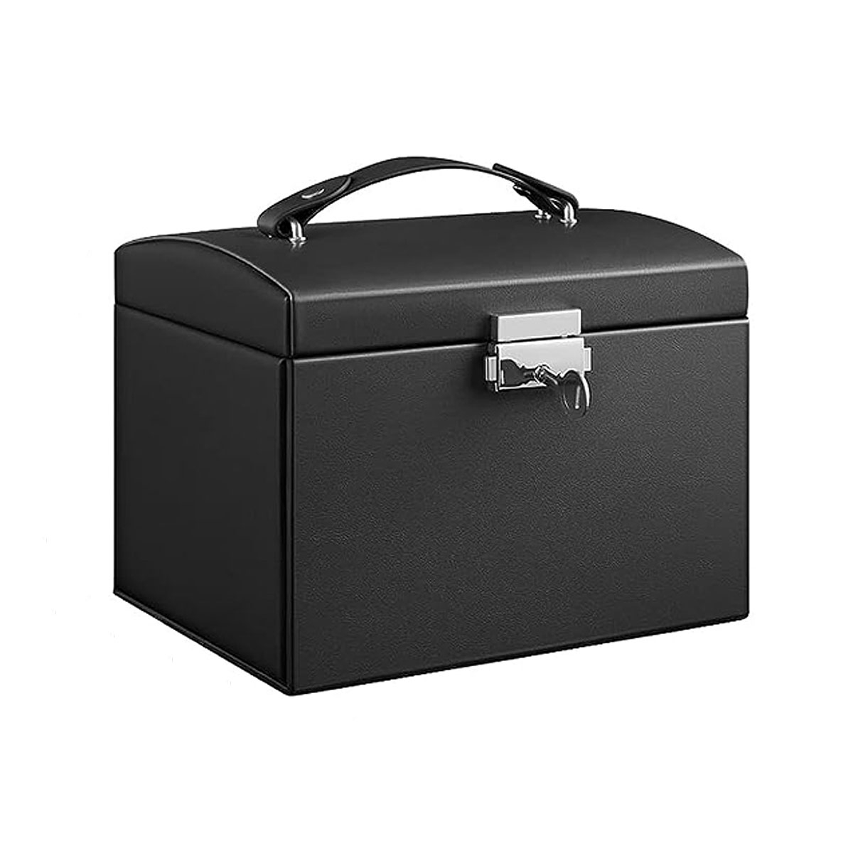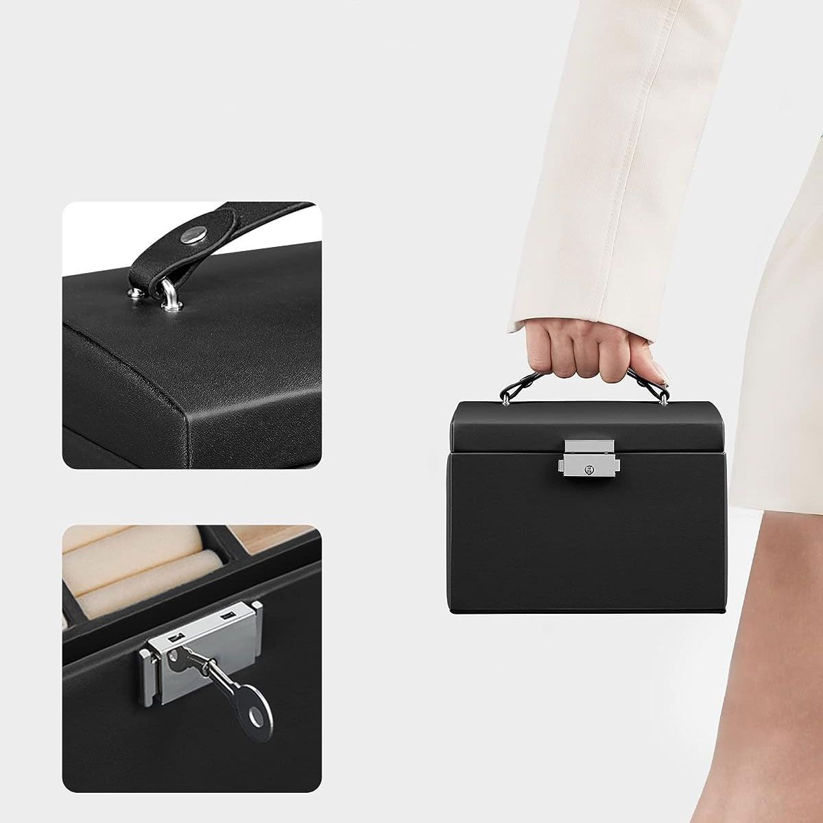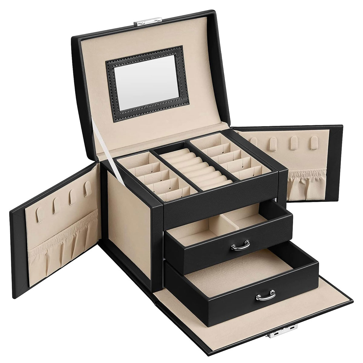 Θήκη κοσμημάτων με καθρέφτη και μοντέρνο σχεδιασμό από την εταιρεία Songmics. Ο σκελετός είναι κατασκευασμένος από ξύλο MDF και είναι ντυμένος με μαύρο συνθετικό δέρμα ενώ το εσωτερικό είναι μπεζ βελούδο. Έχει 1 ανοιγόμενη θήκη με χωρίσματα που δημιουργούν 10 μικρούς χώρους και 1 χώρο κατάλληλο για δαχτυλίδια. Διαθέτει 2 συρταράκια με λαβή ανοίγματος εκ των οποίων το 1 έχει χώρισμα εσωτερικά και δημιουργεί 2 χώρους. Στα πλαϊνά διαθέτει 2 ανοιγόμενες θήκες, κατάλληλες για να κρεμάτε τα κολιέ σας και να μην μπλέκονται. Κλείνει και μεταμορφώνεται σε βαλιτσάκι, ενώ σφραγίζει με κλιπ για εύκολη μεταφορά. Ιδανική μπιζουτιέρα για κολιέ, βραχιόλια, σκουλαρίκια και δαχτυλίδια.