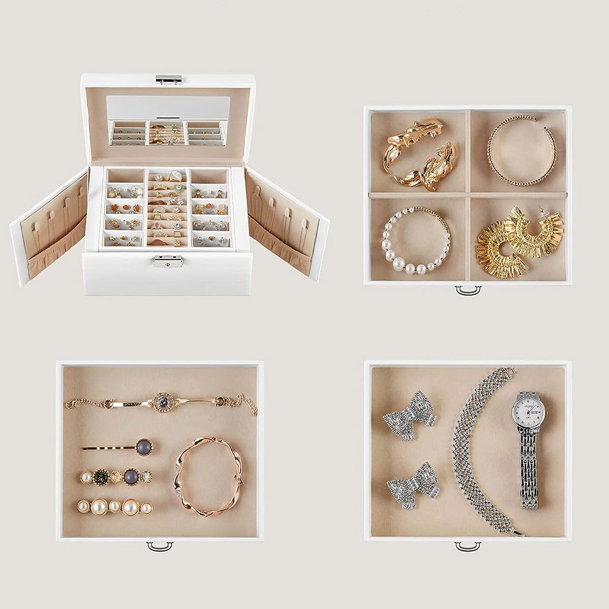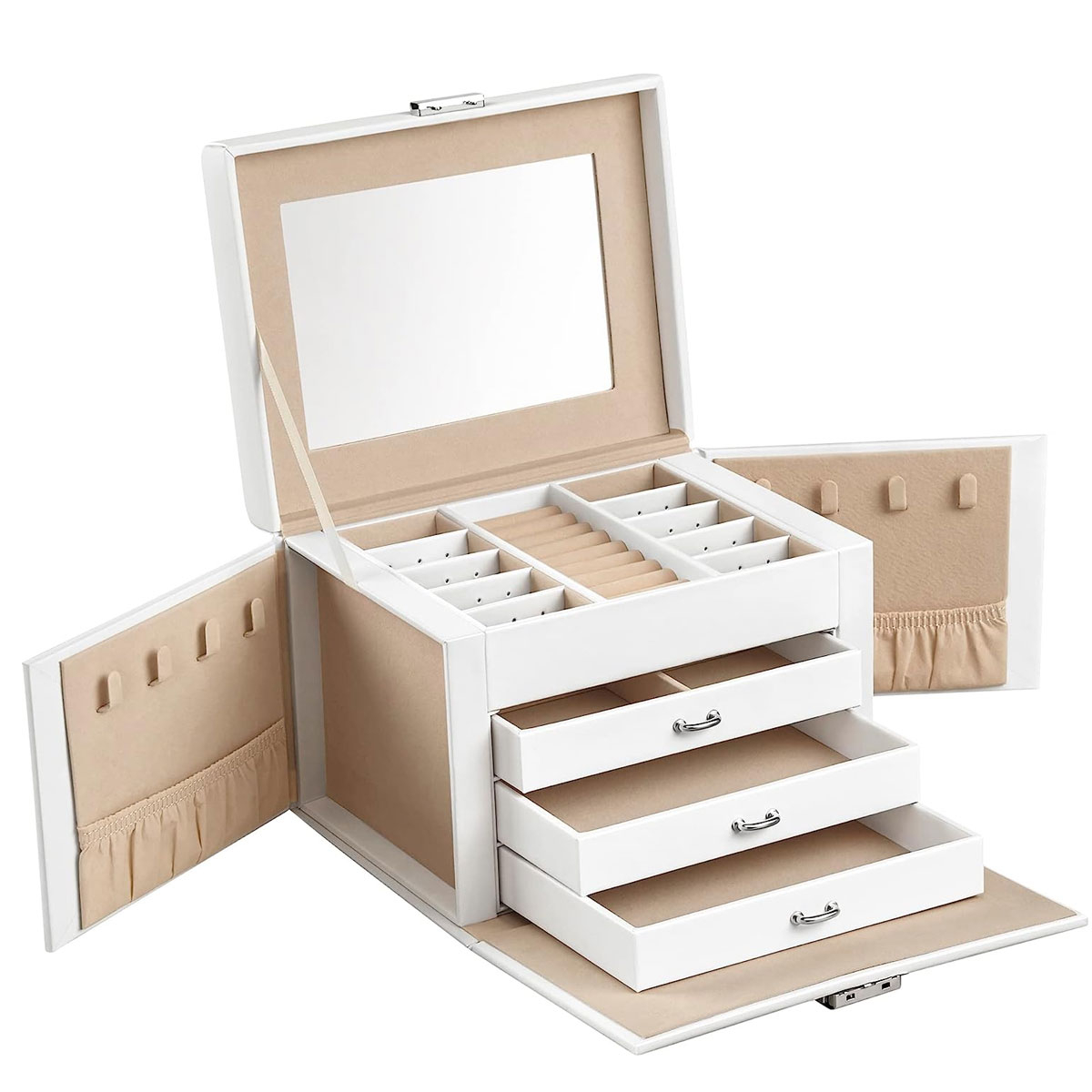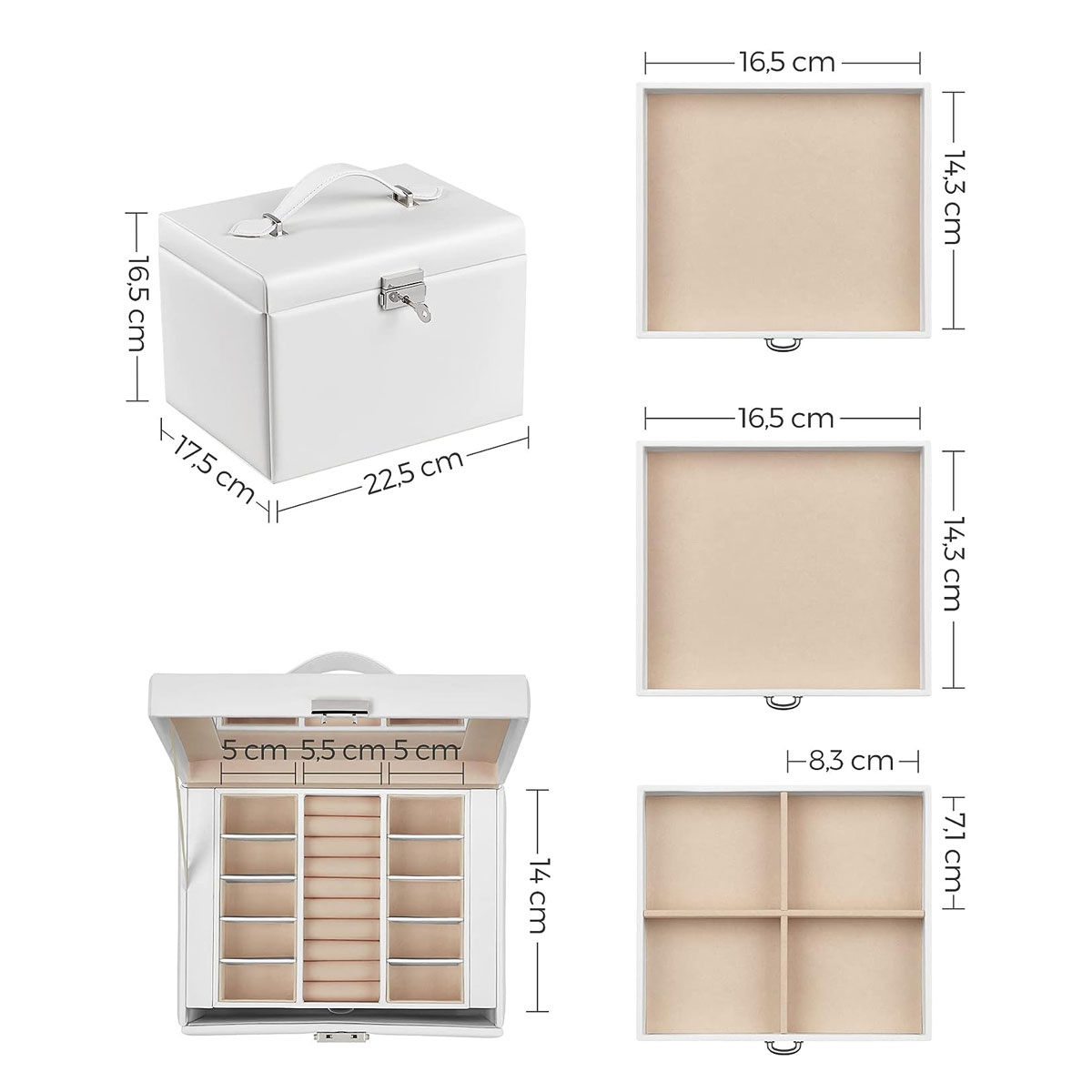 Θήκη κοσμημάτων με καθρέφτη και μοντέρνο σχεδιασμό από την εταιρεία Songmics. Ο σκελετός είναι κατασκευασμένος από ξύλο MDF και είναι ντυμένος με λευκό συνθετικό δέρμα ενώ το εσωτερικό είναι μπεζ βελούδο. Έχει 1 ανοιγόμενη θήκη με χωρίσματα που δημιουργούν 10 μικρούς χώρους και 1 χώρο κατάλληλο για δαχτυλίδια. Διαθέτει 3 συρταράκια με λαβή ανοίγματος εκ των οποίων το 1 έχει χώρισμα εσωτερικά και δημιουργεί 2 χώρους. Στα πλαϊνά διαθέτει 2 ανοιγόμενες θήκες, κατάλληλες για να κρεμάτε τα κολιέ σας και να μην μπλέκονται. Κλείνει και μεταμορφώνεται σε βαλιτσάκι, ενώ σφραγίζει με κλιπ για εύκολη μεταφορά. Ιδανική μπιζουτιέρα για κολιέ, βραχιόλια, σκουλαρίκια και δαχτυλίδια.