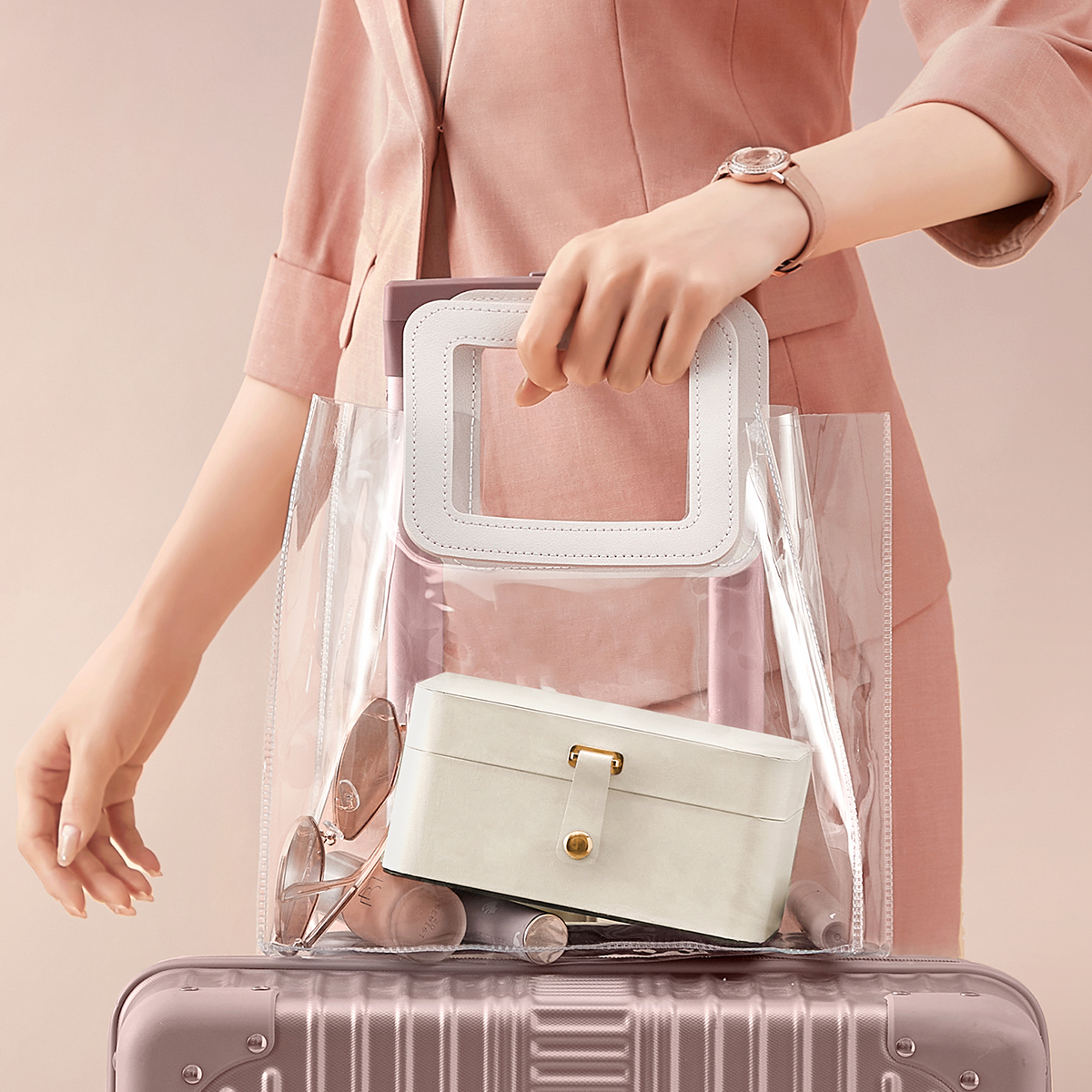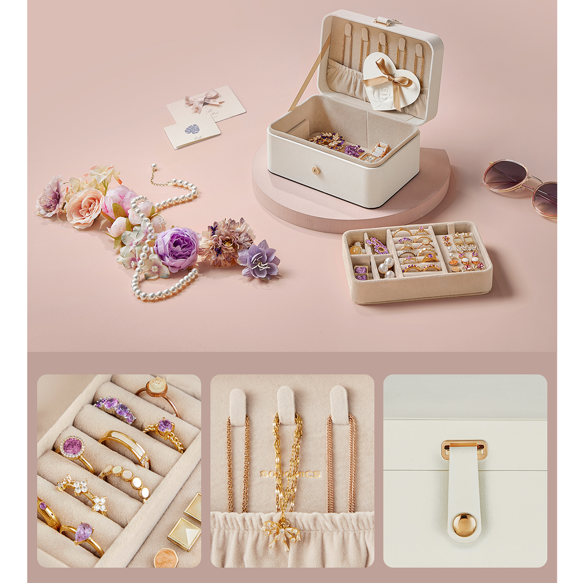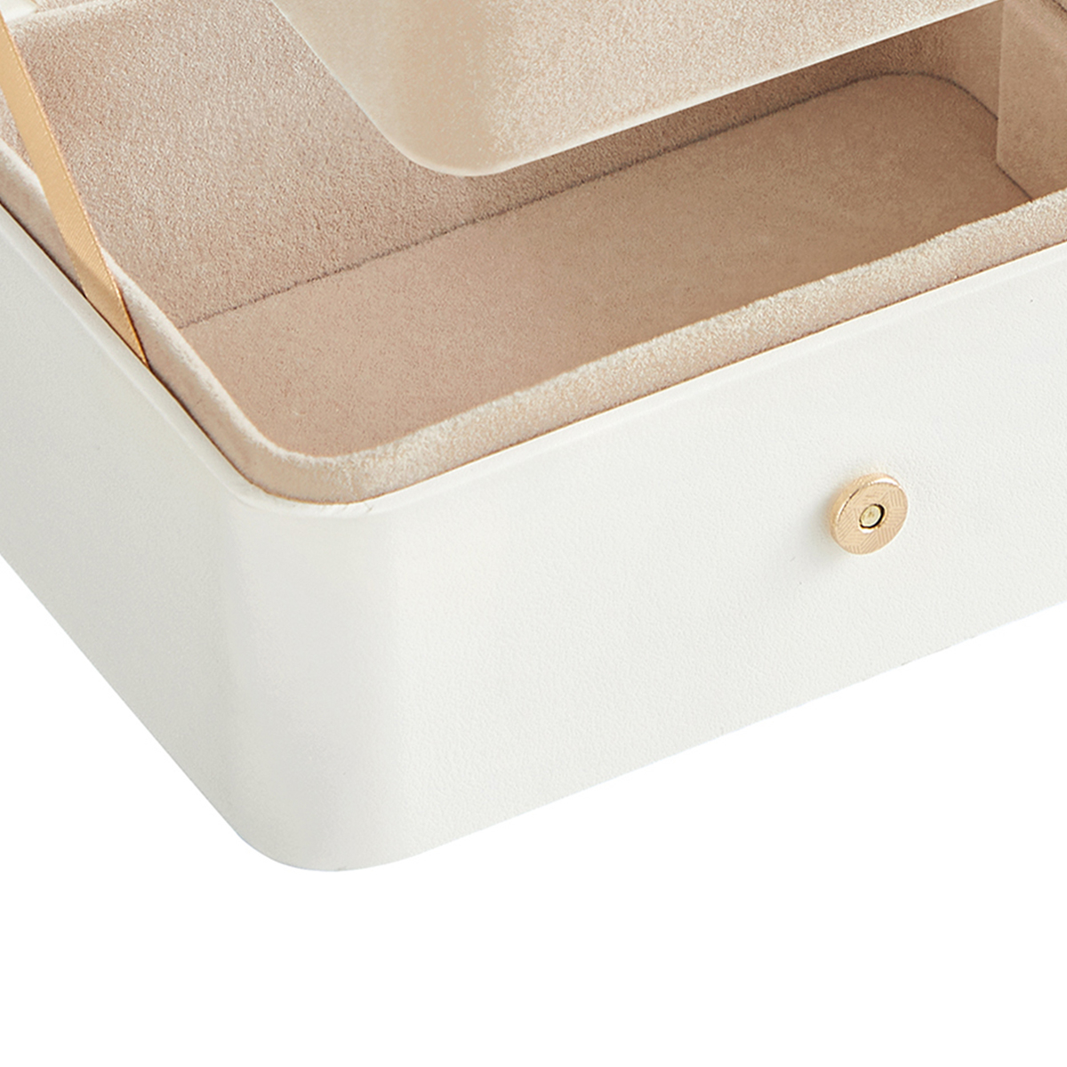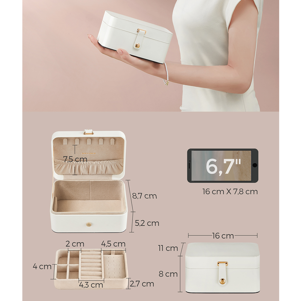 Μίνι θήκη κοσμημάτων ταξιδίου από την εταιρεία Songmics σε λευκό χρώμα. Είναι κατασκευασμένη από πλαστικό υλικό, ενώ εσωτερικά έχει βελουτέ επένδυση. Έχει 1 θήκη με χωρίσματα κατάλληλα για δαχτυλίδια, σκουλαρίκια, βραχιόλια κ.α. Μόλις σηκώσετε την επάνω θήκη αποκαλύπτετε 1 ακόμα ενιαία θήκη. Στη κάτω μεριά από το καπάκι διαθέτει μία τσέπη και άγκιστρα κατάλληλα για να κρεμάτε τα κολιέ σας και να μην μπλέκονται. Ιδανική μπιζουτιέρα για να πάρετε μαζί τα κοσμήματα σας στα ταξίδια σας.