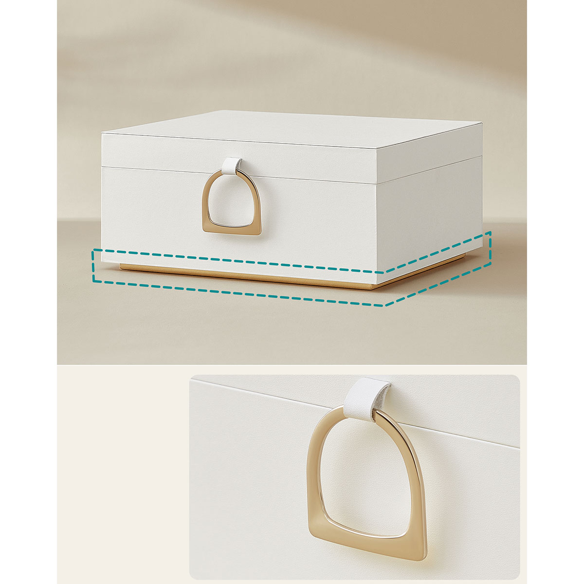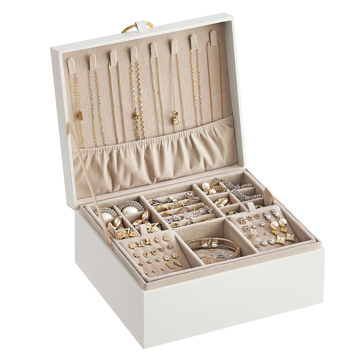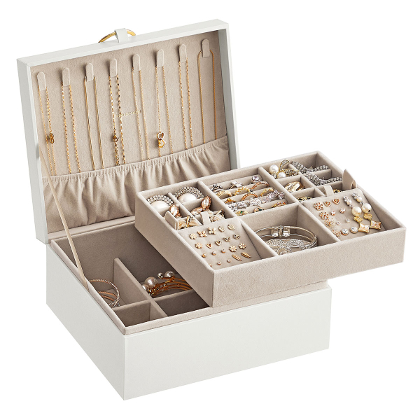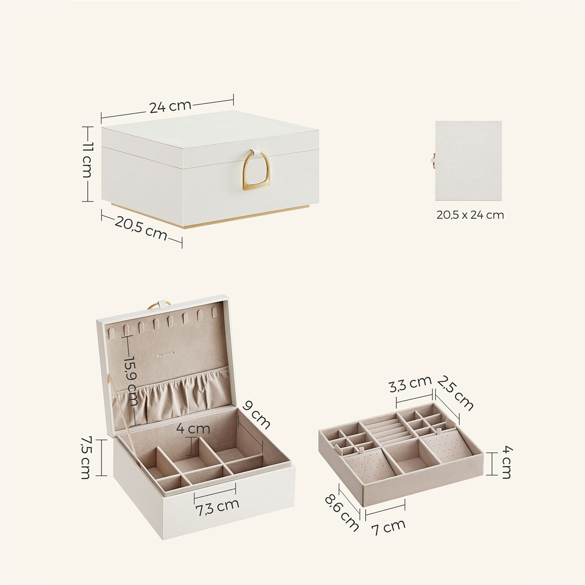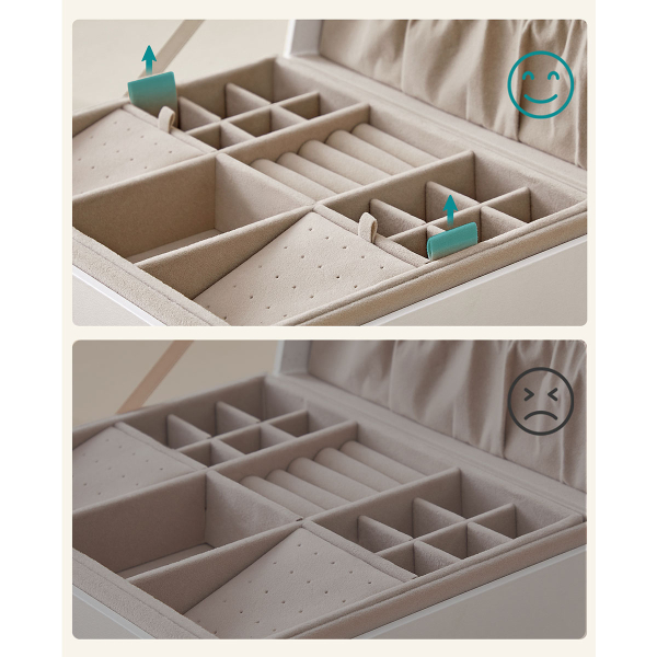 Θήκη κοσμημάτων 2 επιπέδων με μοντέρνο σχεδιασμό από την εταιρεία Songmics. Ο σκελετός είναι κατασκευασμένος από ξύλο MDF σε λευκό χρώμα με χρυσές λεπτομέρειες ενώ το εσωτερικό είναι μπεζ βελούδο. Έχει 1 θήκη με χωρίσματα που δημιουργούν 6 μικρούς χώρους κατάλληλους για δαχτυλίδια, σκουλαρίκια, βραχιόλια κ.α. Μόλις σηκώσετε την επάνω θήκη, από τα ειδικά θηλάκια που διαθέτει, αποκαλύπτετε 1 ακόμα θήκη με χωρίσματα που δημιουργούν 6 μικρούς χώρους. Τα χωρίσματα μπορούν να αφαιρεθούν για να δημιουργήσετε μεγαλύτερες θέσεις για μεγαλύτερα αξεσουάρ όπως γυαλιά ηλίου. Στη κάτω μεριά από το καπάκι διαθέτει άγκυστρα κατάλληλα για να κρεμάτε τα κολιέ σας και να μην μπλέκονται. Ιδανική μπιζουτιέρα για κολιέ, βραχιόλια, σκουλαρίκια και δαχτυλίδια.