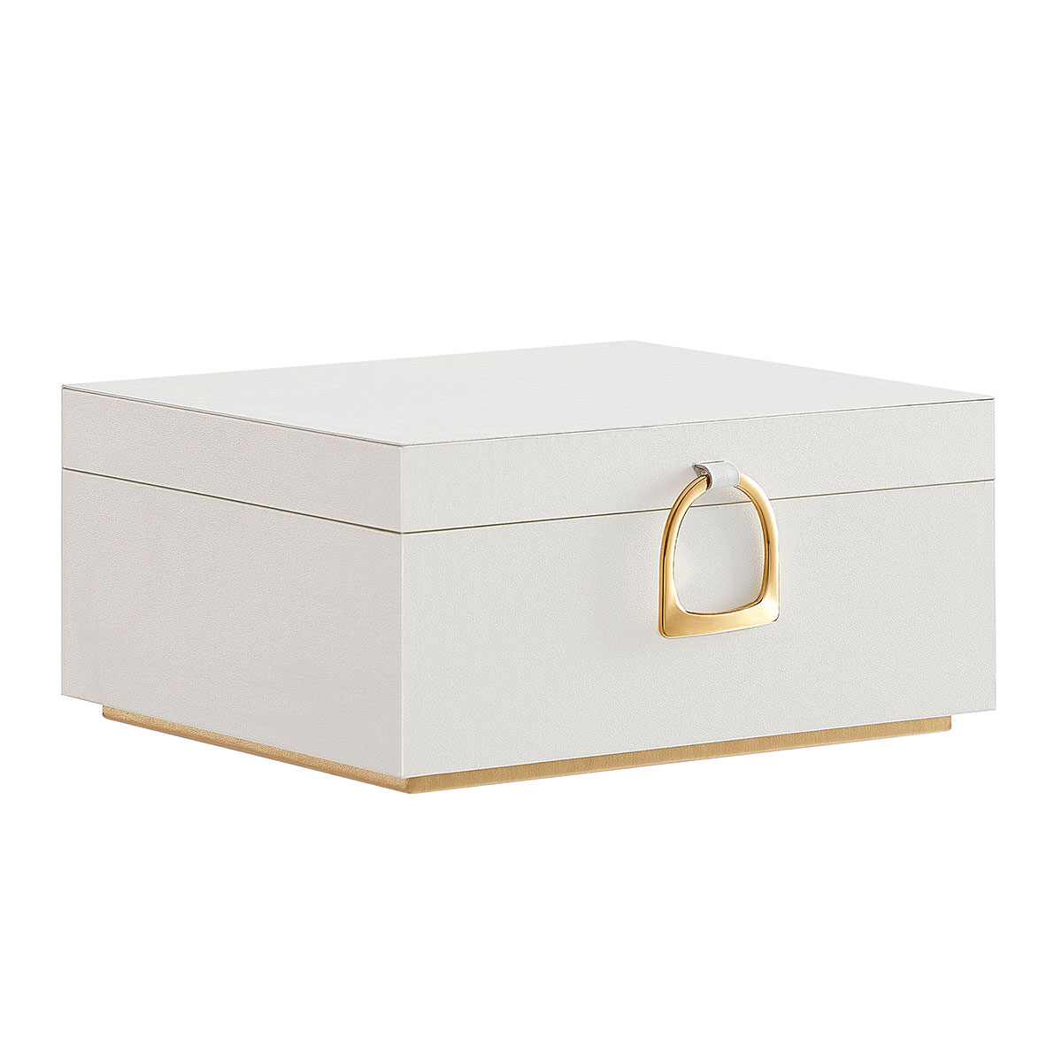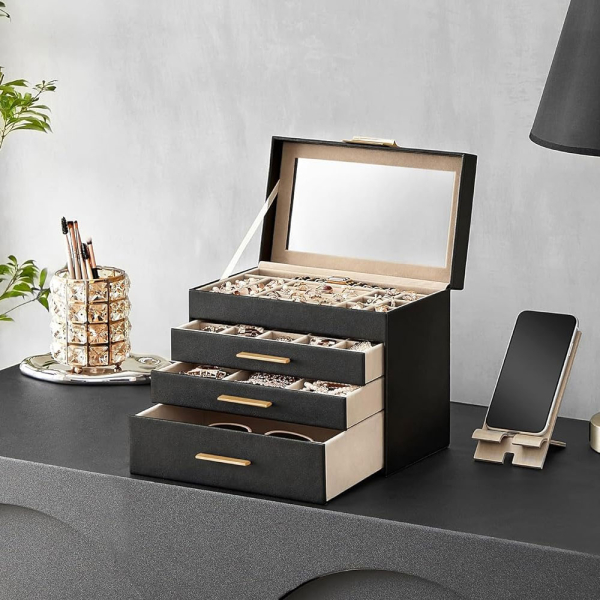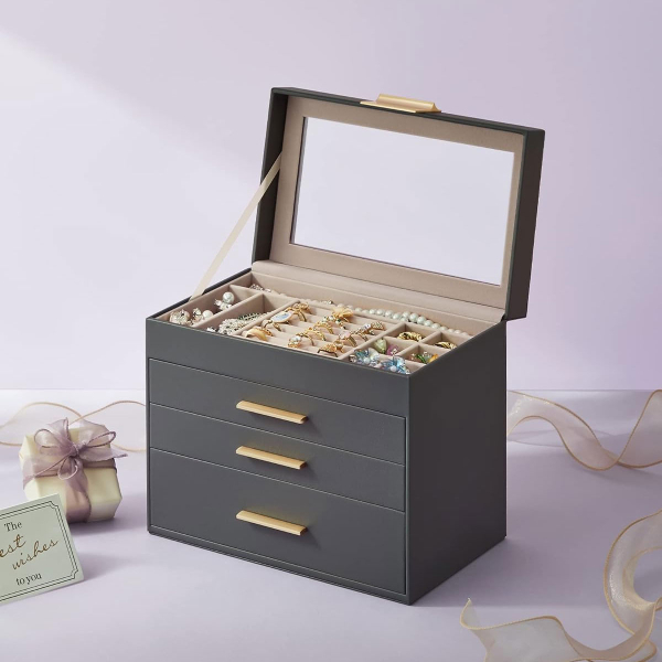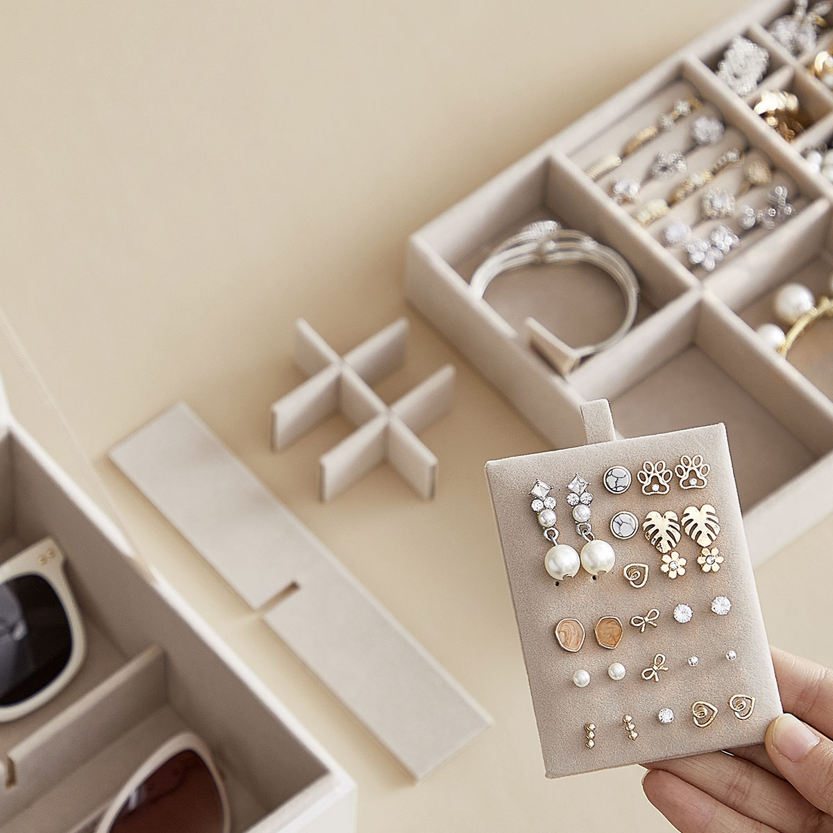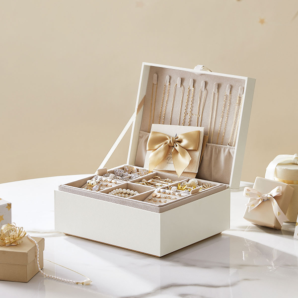 Θήκη κοσμημάτων 2 επιπέδων με μοντέρνο σχεδιασμό από την εταιρεία Songmics. Ο σκελετός είναι κατασκευασμένος από ξύλο MDF σε λευκό χρώμα με χρυσές λεπτομέρειες ενώ το εσωτερικό είναι μπεζ βελούδο. Έχει 1 θήκη με χωρίσματα που δημιουργούν 6 μικρούς χώρους κατάλληλους για δαχτυλίδια, σκουλαρίκια, βραχιόλια κ.α. Μόλις σηκώσετε την επάνω θήκη, από τα ειδικά θηλάκια που διαθέτει, αποκαλύπτετε 1 ακόμα θήκη με χωρίσματα που δημιουργούν 6 μικρούς χώρους. Τα χωρίσματα μπορούν να αφαιρεθούν για να δημιουργήσετε μεγαλύτερες θέσεις για μεγαλύτερα αξεσουάρ όπως γυαλιά ηλίου. Στη κάτω μεριά από το καπάκι διαθέτει άγκυστρα κατάλληλα για να κρεμάτε τα κολιέ σας και να μην μπλέκονται. Ιδανική μπιζουτιέρα για κολιέ, βραχιόλια, σκουλαρίκια και δαχτυλίδια.