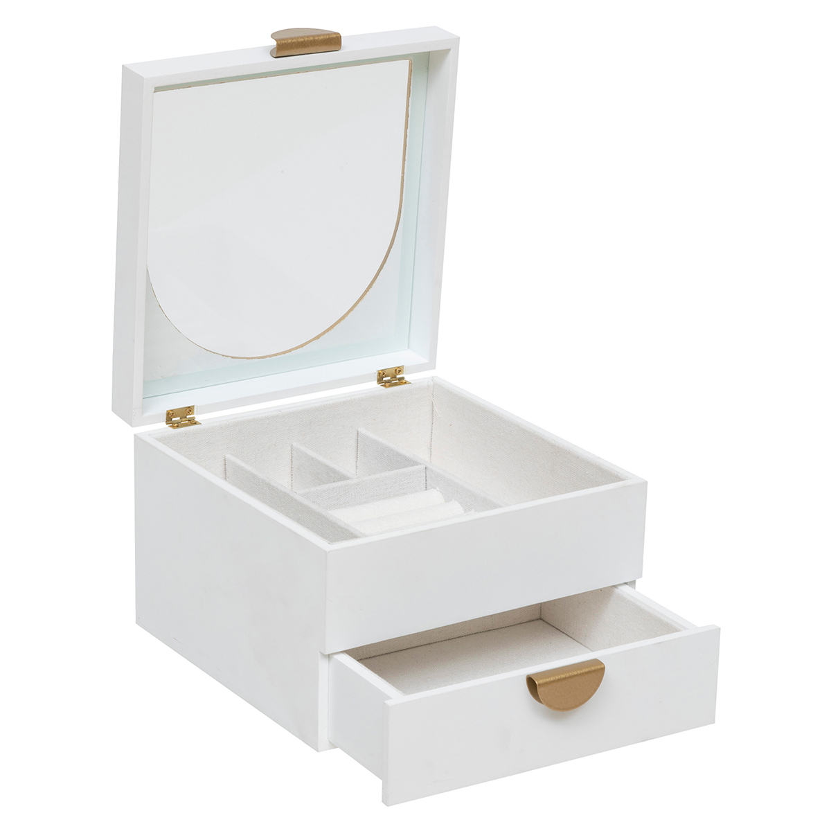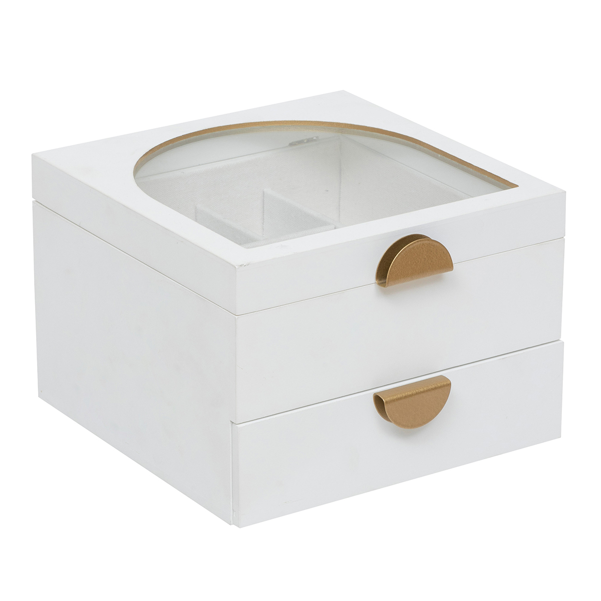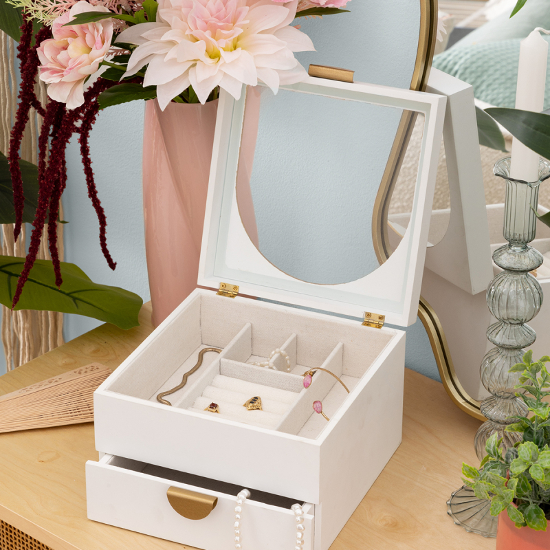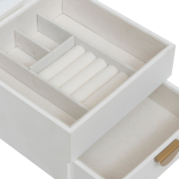 Μπιζουτιέρα με μοντέρνο σχεδιασμό. Είναι κατασκευασμένη από ξύλο MDF_E1 σε λευκό χρώμα με χρυσές μεταλλικές λεπτομέρειες. Έχει 2 μικρές θέσεις και 2 μεγαλύτερες για σκουλαρίκια ή βραχιόλια και θέσεις για δακτυλίδια. Στο κάτω μέρος διαθέτει συρτάρι. Ένα μέρος από το καπάκια είναι διάφανο για να μπορείτε να βλέπετε στο εσωτερικό. Ιδανική για να τακτοποιήσει και να οργανώσει τα κοσμήματα και τα αξεσουάρ σας.