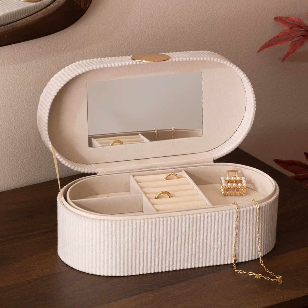 Θήκη κοσμημάτων ιδανική για κολιέ, βραχιόλια, σκουλαρίκια και δαχτυλίδια. Είναι κατασκευασμένη από βελούδινο ύφασμα σε εκρού χρώμα με ανάγλυφο σχέδιο και διαθέτει χρυσό κούμπωμα. Εσωτερικά έχει χωρίσματα και έναν αφαιρούμενο όροφο για να είναι πιο εύκολη η τακτοποίηση των κοσμημάτων. Ιδανική για να κρατάει τακτοποιημένα τα κοσμήματά σας χωρίς χτυπήματα ή γρατζουνιές.