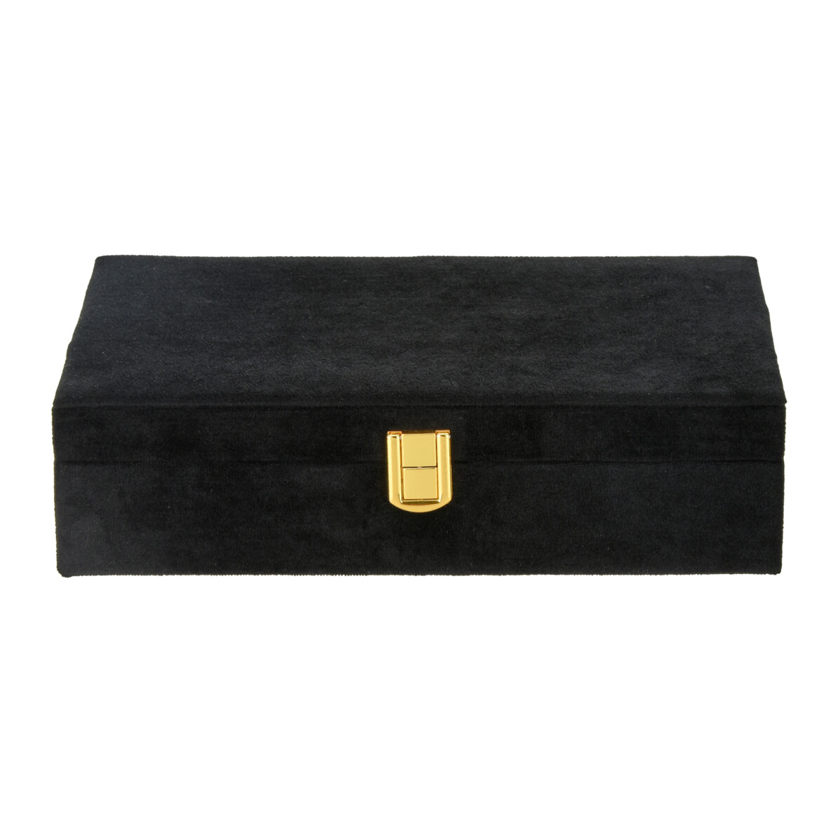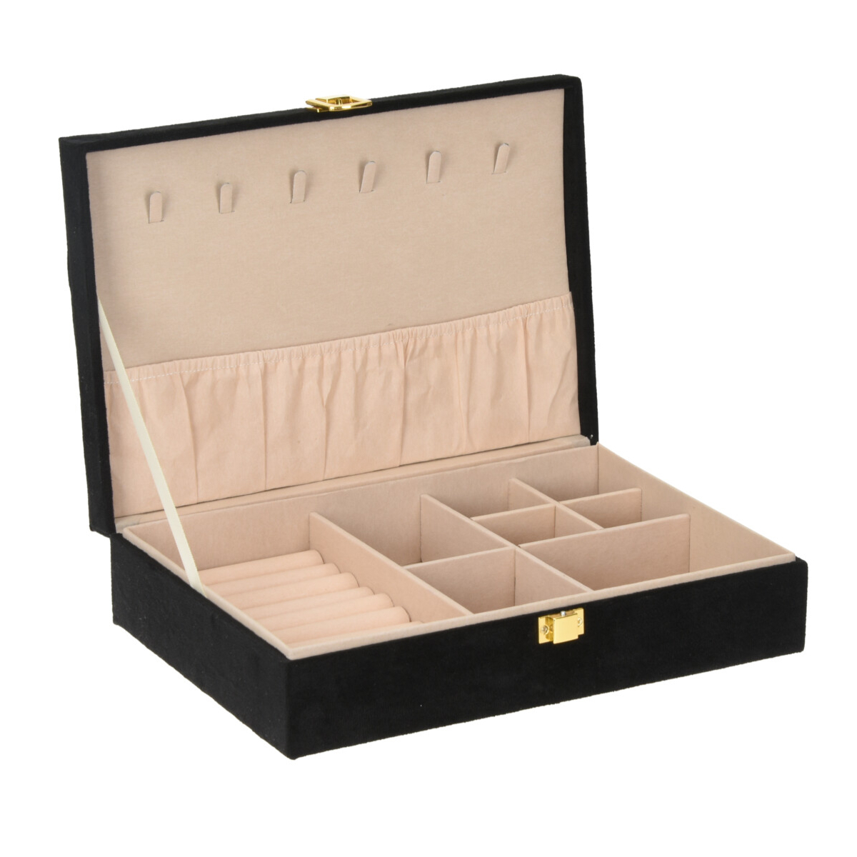Θήκη κοσμημάτων σε μαύρο χρώμα. Ο σκελετός είναι κατασκευασμένος από ξύλο και είναι ντυμένος από μαύρο βελουτέ ύφασμα. Έχει χωρίσματα που δημιουργούν 4 μικρούς χώρους, 3 μεγαλύτερους και 1 χώρο κατάλληλο για δαχτυλίδια. Στην εσωτερική μεριά του καπακιού έχει 6 άγκιστρα για να κρεμάτε τα κολιέ σας. Διαθέτει επίσης 7 υφασμάτινες θήκες για να αποθηκεύετε σκουλαρίκια ή ότι άλλο επιθυμείτε. Σφραγίζει με κλιπ για εύκολη μεταφορά. Ιδανική για κολιέ, βραχιόλια, σκουλαρίκια και δαχτυλίδια.
