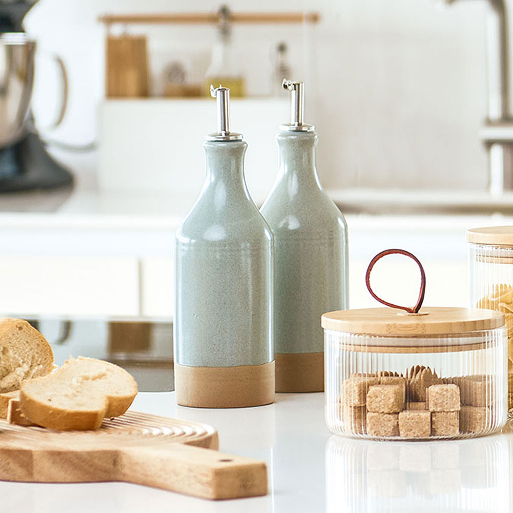 Μπουκάλι για το λάδι ή το ξύδι με μοντέρνο σχέδιο. Είναι κατασκευασμένο από κεραμικό υλικό σε γκρι-βεραμάν χρώμα με καφέ λεπτομέρεια. Διαθέτει ασημί πώμα από ανοξείδωτο ατσάλι για μεταφορά χωρίς διαρροές. Ιδανικό μπουκάλι για το τραπέζι σας. Χωρητικότητα 420ml.