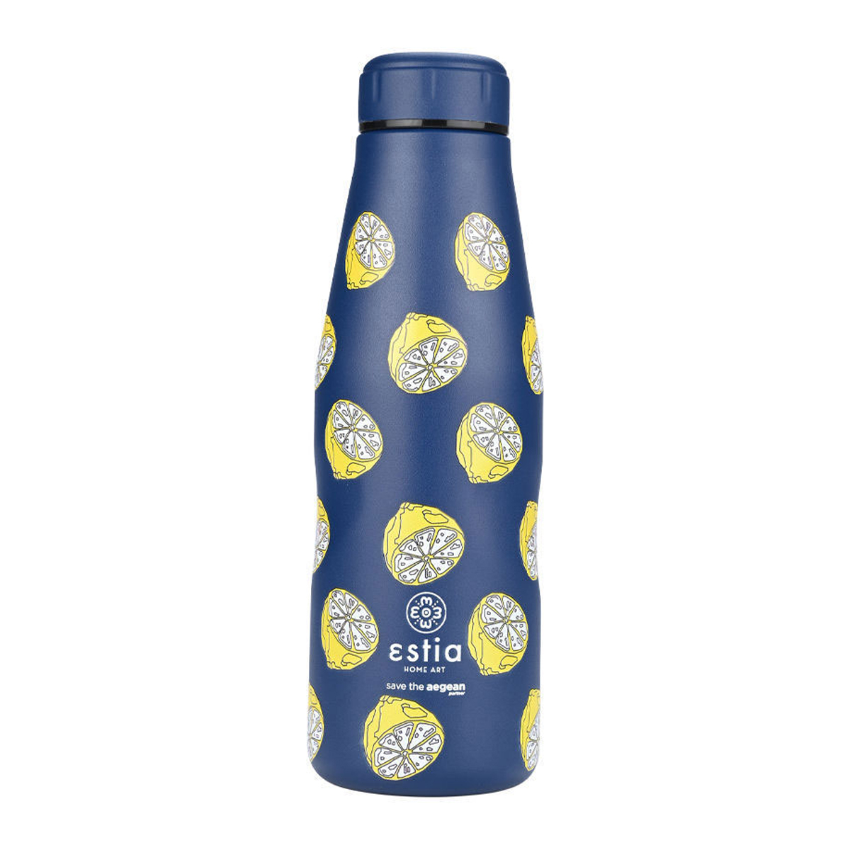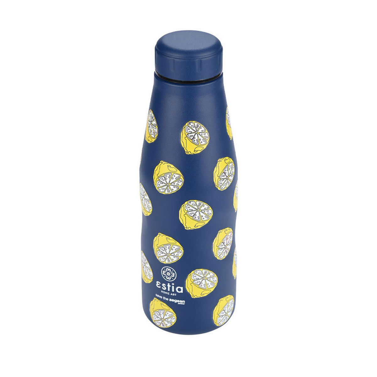 Μπουκάλι θερμός 500ml από την εταιρεία εstia σε μπλε χρώμα με λεμόνια στο σχέδιο. Είναι μέρος της συλλογής "Save The Aegean". Η εταιρεία εstia συνεισφέρει στον οργανισμό "Save The Aegean" με 1% επί των πωλήσεων, για καθαρότερες θάλασσες και ένα καλύτερο αύριο.Είναι κατασκευασμένο από ανοξείδωτο ατσάλι 18/8 που ανταποκρίνεται σε υψηλές απαιτήσεις, εγγυάται μεγαλύτερη αντοχή στη μακροχρόνια χρήση και 100% αναλλοίωτη γεύση των υγρών. Το προϊόν είναι απαλλαγμένο από ουσίες BPA και είναι ασφαλές για επαφή με τρόφιμα και υγρά. H ενισχυμένη μόνωση διπλού τοιχώματος διατηρεί κρύο έως 24 ώρες και ζεστό έως 12 ώρες το ρόφημα, με τη θερμοκρασία του εξωτερικού τοιχώματος να παραμένει σταθερή. Έχει άνετο κράτημα καθώς δεν «ιδρώνει». Το καπάκι είναι 100% στεγανό ώστε να αποφεύγονται οι διαρροές. Το χρώμα τοποθετείται μέσω της τεχνικής powder coating, η οποία προσφέρει ένα ματ αποτέλεσμα και μεγάλη αντοχή στην μακροχρόνια χρήση. Ιδανικό για την βόλτα, το ταξίδι, το γραφείο. Το λογότυπο είναι χαραγμένο πάνω στο προϊόν. Η συσκευασία του είναι κατασκευασμένη από 100% ανακυκλώσιμα υλικά και μπορεί να χρησιμοποιηθεί για πολλαπλές χρήσεις.