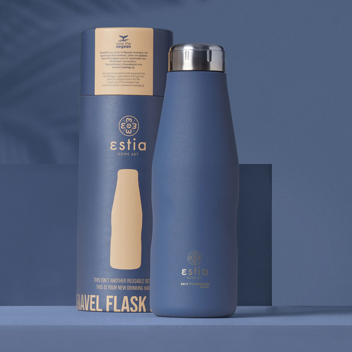Θερμός της εταιρείας εstia από την σειρά "Save The Aegean". Η εταιρεία εstia συνεισφέρει στον οργανισμό "Save The Aegean" με 1% επί των πωλήσεων, για καθαρότερες θάλασσες και ένα καλύτερο αύριο. Άριστη ποιότητα κατασκευής από ανοξείδωτο ατσάλι 304 που ανταποκρίνεται σε υψηλές απαιτήσεις, εγγυάται μεγαλύτερη αντοχή στη μακροχρόνια χρήση και 100% αναλλοίωτη γεύση των υγρών. Το προϊόν είναι απαλλαγμένο από ουσίες BPA και είναι ασφαλές για επαφή με τρόφιμα και υγρά. Το διπλό τοίχωμα διατηρεί τα υγρά 24 ώρες κρύα και 12 ώρες ζεστά. Ασφαλίζει άριστα και είναι 100% leak proof. Το μπλε χρώμα τοποθετείται μέσω της αποτελεσματικότερης τεχνικής powder coating, η οποία προσφέρει ένα ματ αποτέλεσμα και μεγάλη αντοχή στην μακροχρόνια χρήση. Το λογότυπο είναι χαραγμένο πάνω στο προϊόν. Η συσκευασία του είναι κατασκευασμένη από 100% ανακυκλώσιμο χαρτόνι και μπορεί να χρησιμοποιηθεί για πολλαπλές χρήσεις.