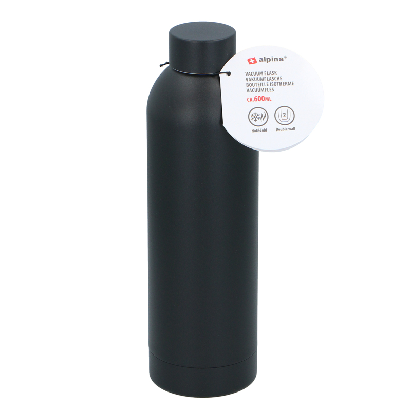 Θερμός σε μαύρο χρώμα με χωρητικότητα 600ml από την εταιρεία Alpina. Είναι κατασκευασμένο από ανοξείδωτο ατσάλι, ασφαλές για επαφή με τρόφιμα και υγρά. Το διπλό τοίχωμα διατηρεί τα υγρά 12 ώρες κρύα και 5-6 ώρες ζεστά. Διαθέτει ανοξείδωτο καπάκι που ασφαλίζει άριστα και είναι 100% leak proof. Ιδανικό για την βόλτα, το ταξίδι, το γραφείο καθώς μεταφέρεται εύκολα σε κάθε διαδρομή σας. Συνδυάστε το με τα υπόλοιπα είδη της ίδιας συλλογής για ένα ολοκληρωμένο αποτέλεσμα.