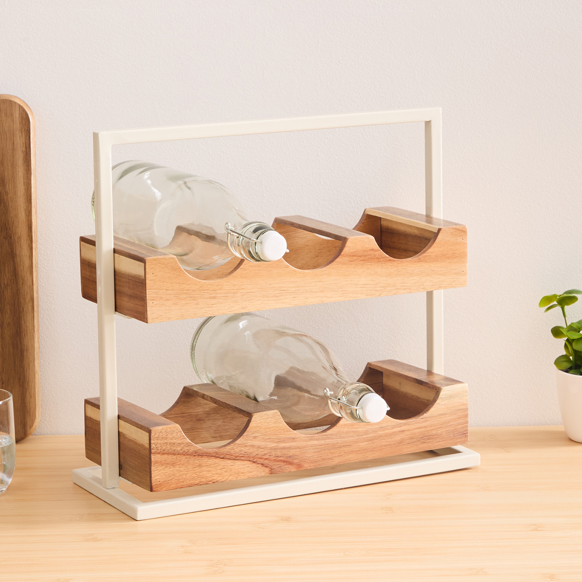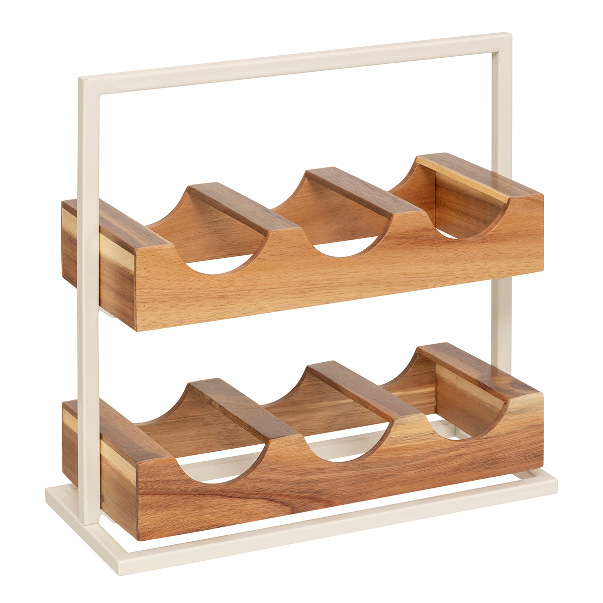 Μπουκαλοθήκη 6 θέσεων για να αποθηκεύσετε τα μπουκάλια των κρασιών ή των ποτών σας. Είναι κατασκευασμένη από ξύλο ακακίας σε φυσική απόχρωση και εκρού μεταλλικό σκελετό. Ιδανική για να κρατήσετε οργανωμένη την κάβα σας στο σαλόνι, την τραπεζαρία ή την κουζίνα.