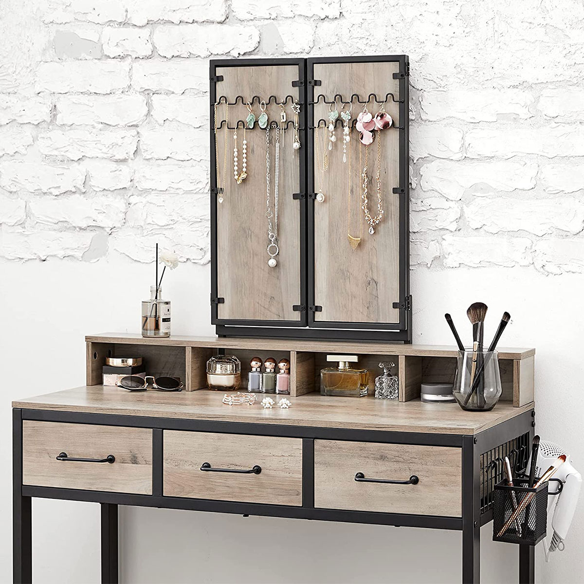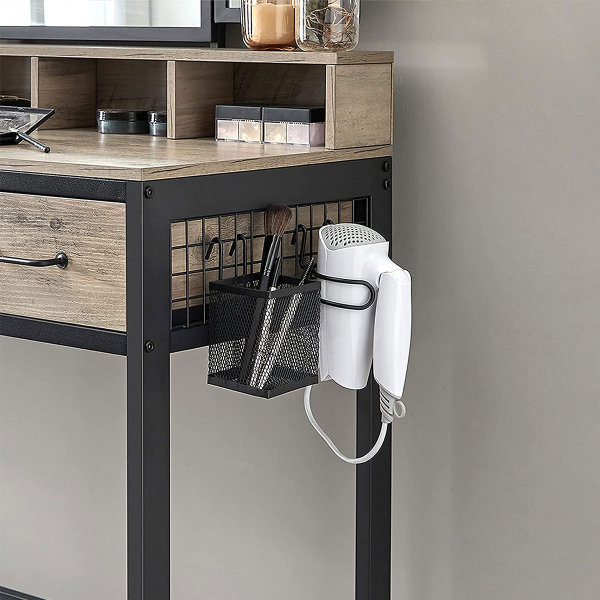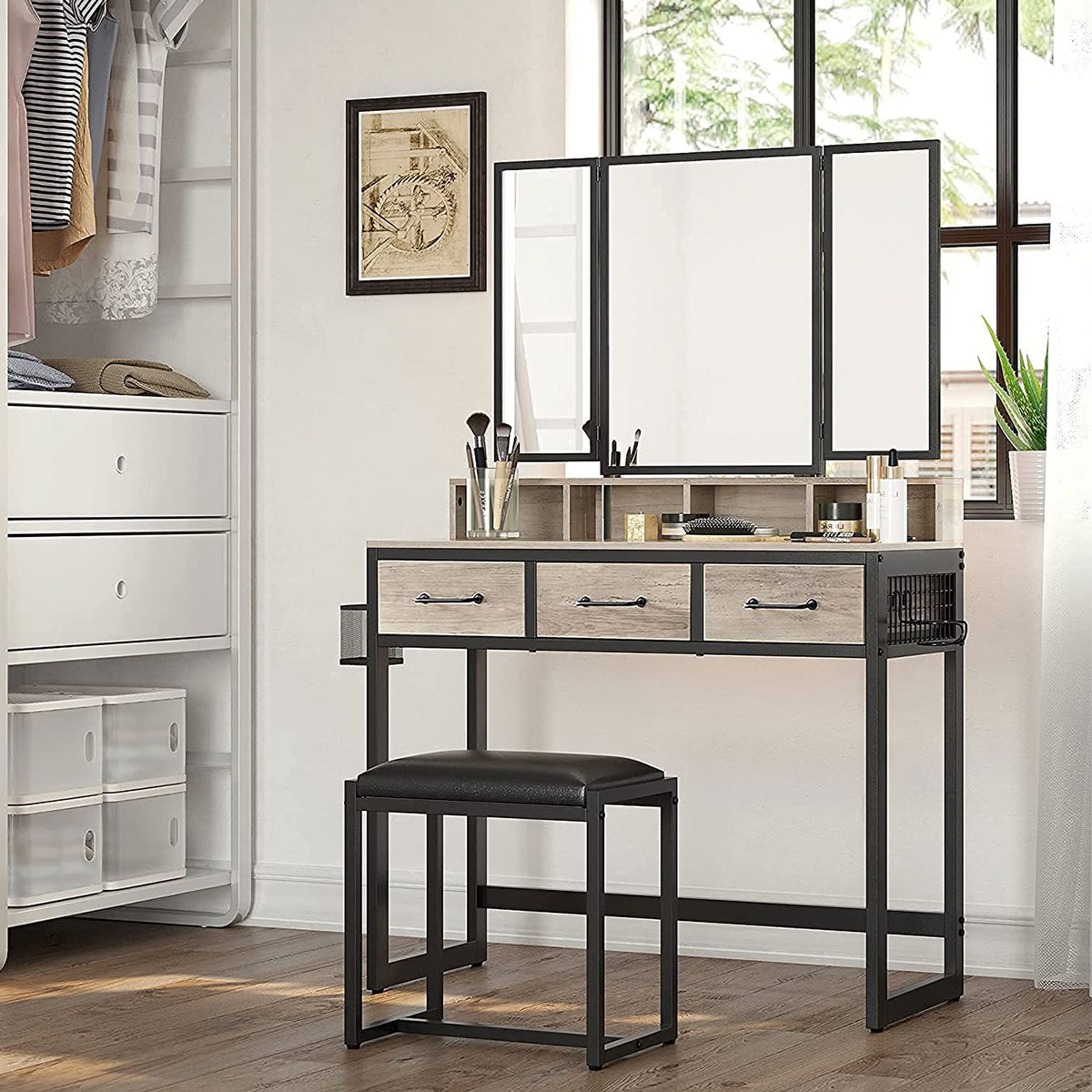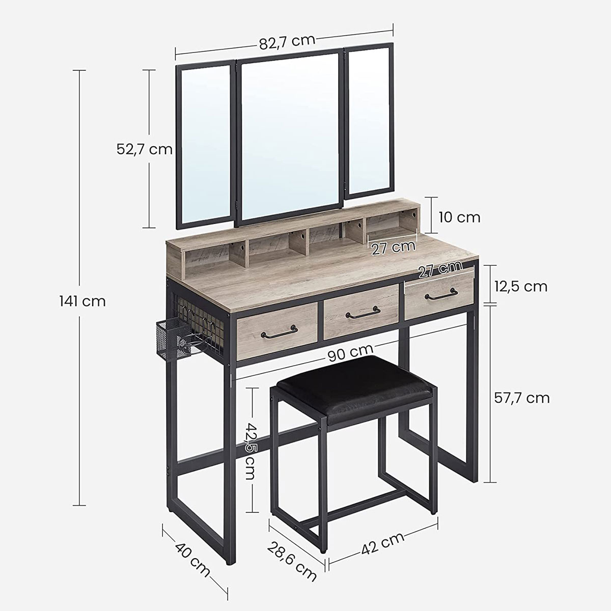 Τουαλέτα κρεβατοκάμαρας από την εταιρεία Vasagle σε γκρι-μπεζ χρώμα και μαύρο σκελετό. Διαθέτει τρίπτυχο καθρέφτη για να μπορείτε εύκολα να κάνετε το μακιγιάζ σας ή να φτιάξετε τα μαλλιά σας, συρτάρια για να τοποθετήσετε τα καλλυντικά σας, σκαμπό, βάση για πιστολάκι, κρεμαστή θήκη οργάνωσης και κρεμαστράκια για τα κοσμήματα σας. Ιδανικό έπιπλο για να έχετε οργανωμένα τα προϊόντα ομορφιάς ή τα κοσμήματα που χρησιμοποιείτε καθημερινά. Το προϊόν έρχεται αμοντάριστο και συναρμολογείται βάσει οδηγιών.