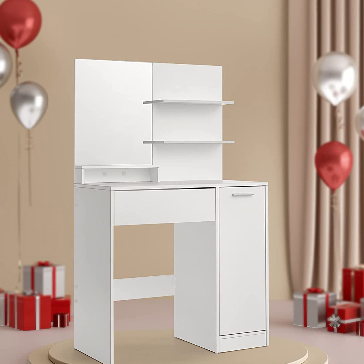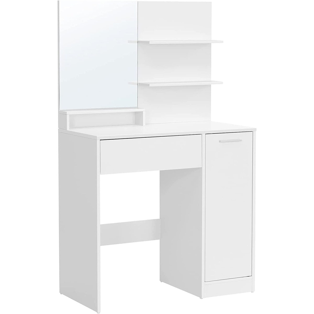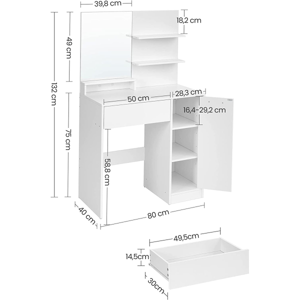 Τουαλέτα κρεβατοκάμαρας σε λευκό χρώμα και μοντέρνο σχέδιο από την εταιρεία Vasagle. Κατασκευασμένη από μοριοσανίδα, είναι ιδανική για να στολίσει τον χώρο της κρεβατοκάμαράς σας. Διαθέτει 1 συρτάρι με πλάτος 50εκ. και 3 μικρά ντουλάπια 16.4-29.2εκ.Μx28.3εκ.Π. Διαθέτει επιπλέον 2 ράφια με μήκος 18.2 εκ.*Το προϊόν έρχεται αμοντάριστο.*