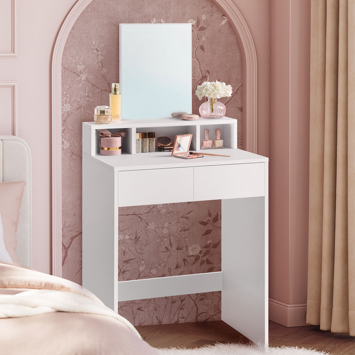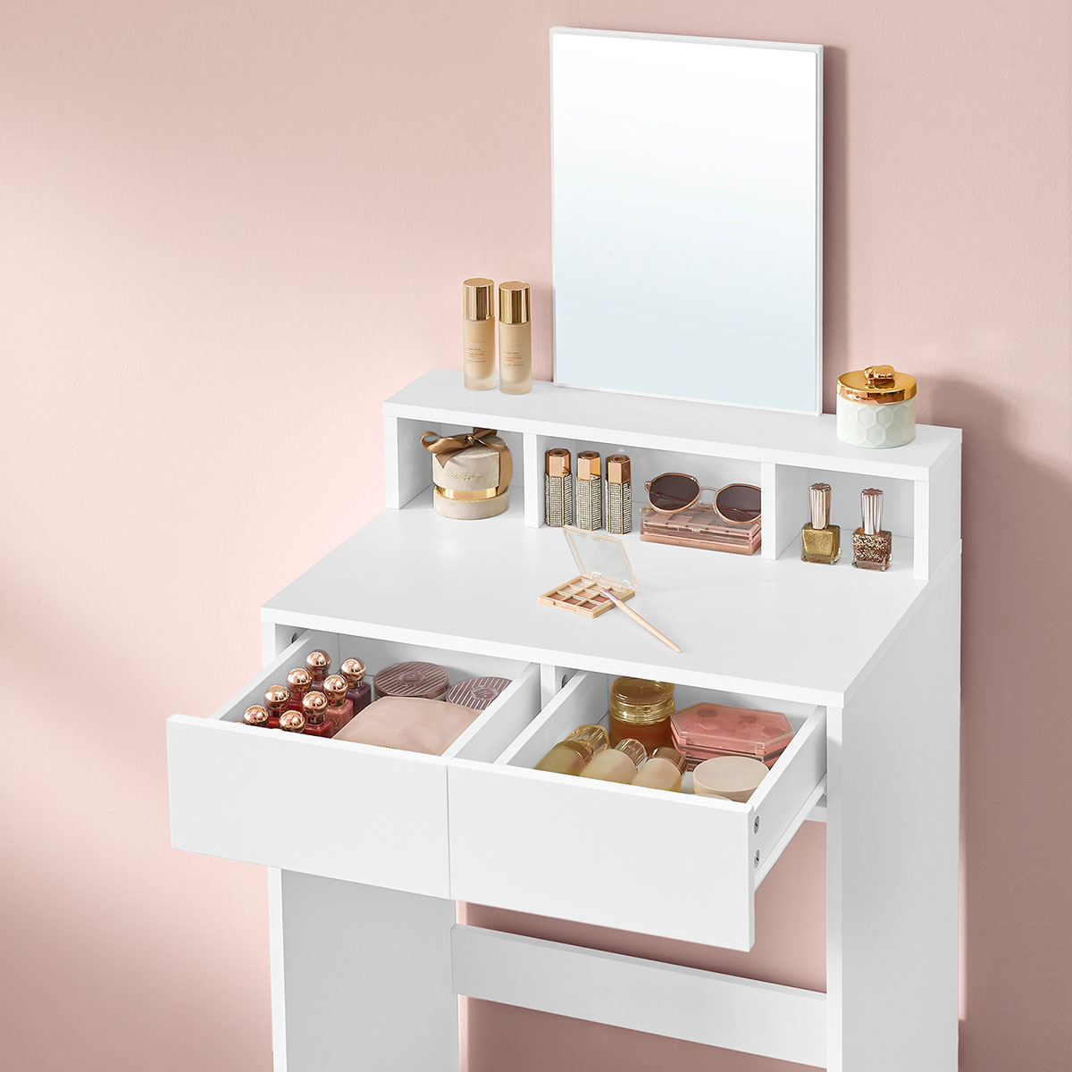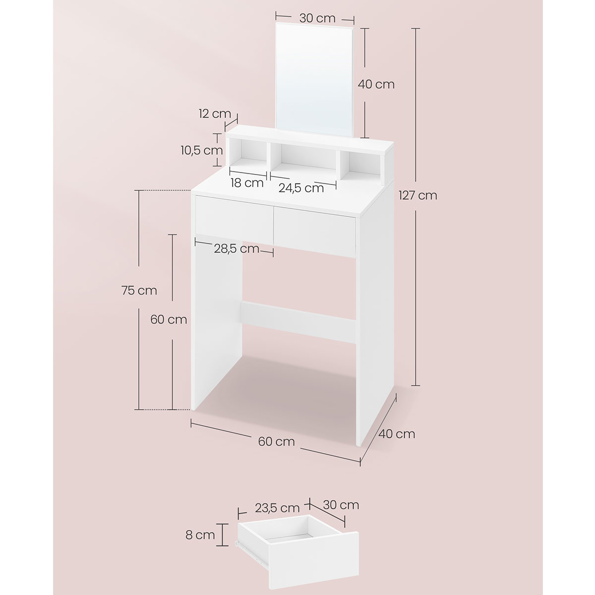 Τουαλέτα κρεβατοκάμαρας με καθρέφτη από την εταιρεία Vasagle. Είναι κατασκευασμένη από μοριοσανίδα σε λευκό χρώμα. Διαθέτει καθρέφτη για να μπορείτε εύκολα να κάνετε το μακιγιάζ σας ή να φτιάξετε τα μαλλιά σας. Έχει 3 ράφια και 2 συρτάρια για να τοποθετήσετε τα κοσμήματά σας ή ότι άλλο θέλετε. Ιδανικό έπιπλο για να έχετε οργανωμένα τα προϊόντα ομορφιάς ή τα κοσμήματα που χρησιμοποιείτε καθημερινά. *Το προϊόν έρχεται αμοντάριστο και συναρμολογείται βάσει οδηγιών.*