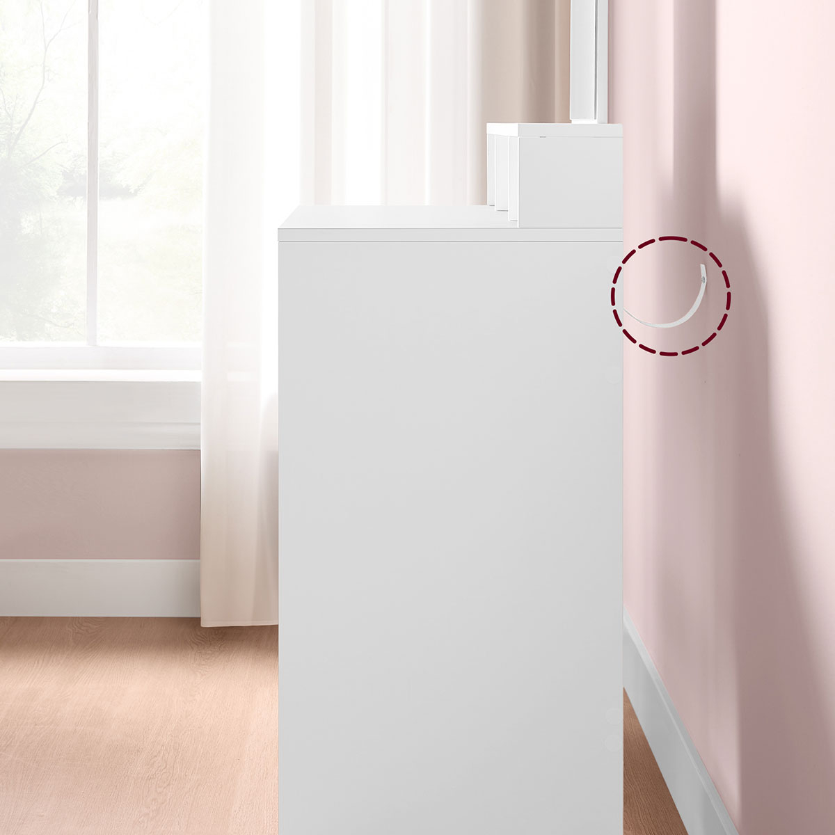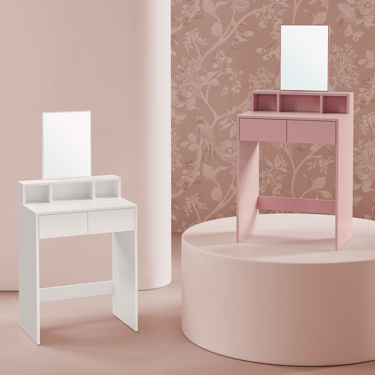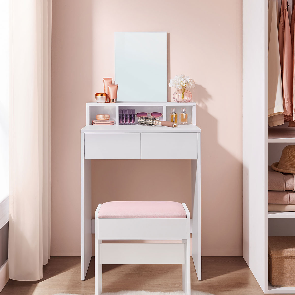 Τουαλέτα κρεβατοκάμαρας με καθρέφτη από την εταιρεία Vasagle. Είναι κατασκευασμένη από μοριοσανίδα σε λευκό χρώμα. Διαθέτει καθρέφτη για να μπορείτε εύκολα να κάνετε το μακιγιάζ σας ή να φτιάξετε τα μαλλιά σας. Έχει 3 ράφια και 2 συρτάρια για να τοποθετήσετε τα κοσμήματά σας ή ότι άλλο θέλετε. Ιδανικό έπιπλο για να έχετε οργανωμένα τα προϊόντα ομορφιάς ή τα κοσμήματα που χρησιμοποιείτε καθημερινά. *Το προϊόν έρχεται αμοντάριστο και συναρμολογείται βάσει οδηγιών.*