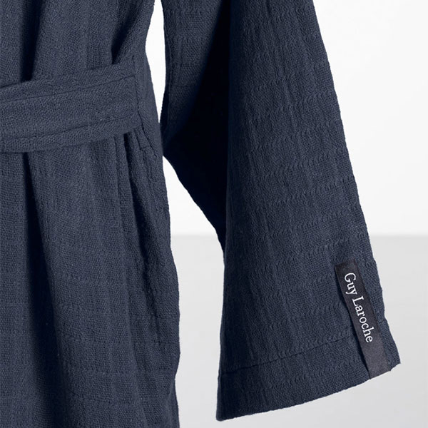 Μπουρνούζι ενηλίκων με γιακά σε μπλε χρώμα και διακριτικό σχέδιο από την εταιρεία Guy Laroche. Κατασκευασμένο από 100% οργανικό βαμβάκι που το καθιστά μαλακό και ανθεκτικό. Ιδανικό για χρήση μετά το μπάνιο. Έρχεται σε συσκευασία πουγκί.