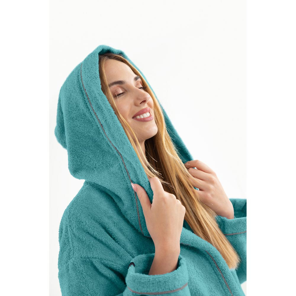 Μπουρνούζι ενηλίκων με κουκούλα σε πετρόλ χρώμα από την εταιρεία Guy Laroche. Είναι κατασκευασμένο από 100% βαμβάκι που το καθιστά εξαιρετικά απαλό και απορροφητικό.