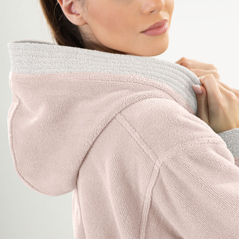 Μπουρνούζι με κουκούλα σε ροζ χρώμα με εκρού λεπτομέρειες από την εταιρεία Guy Laroche. Έχει βελουτέ υφή και σύνθεση από 60% βαμβάκι - 40% polyester που το καθιστά εξαιρετικά μαλακό και απορροφητικό. Διαθέτει ζώνη, τσέπες και κεντητό λογότυπο. Ιδανικό για το καθημερινό σας μπάνιο.