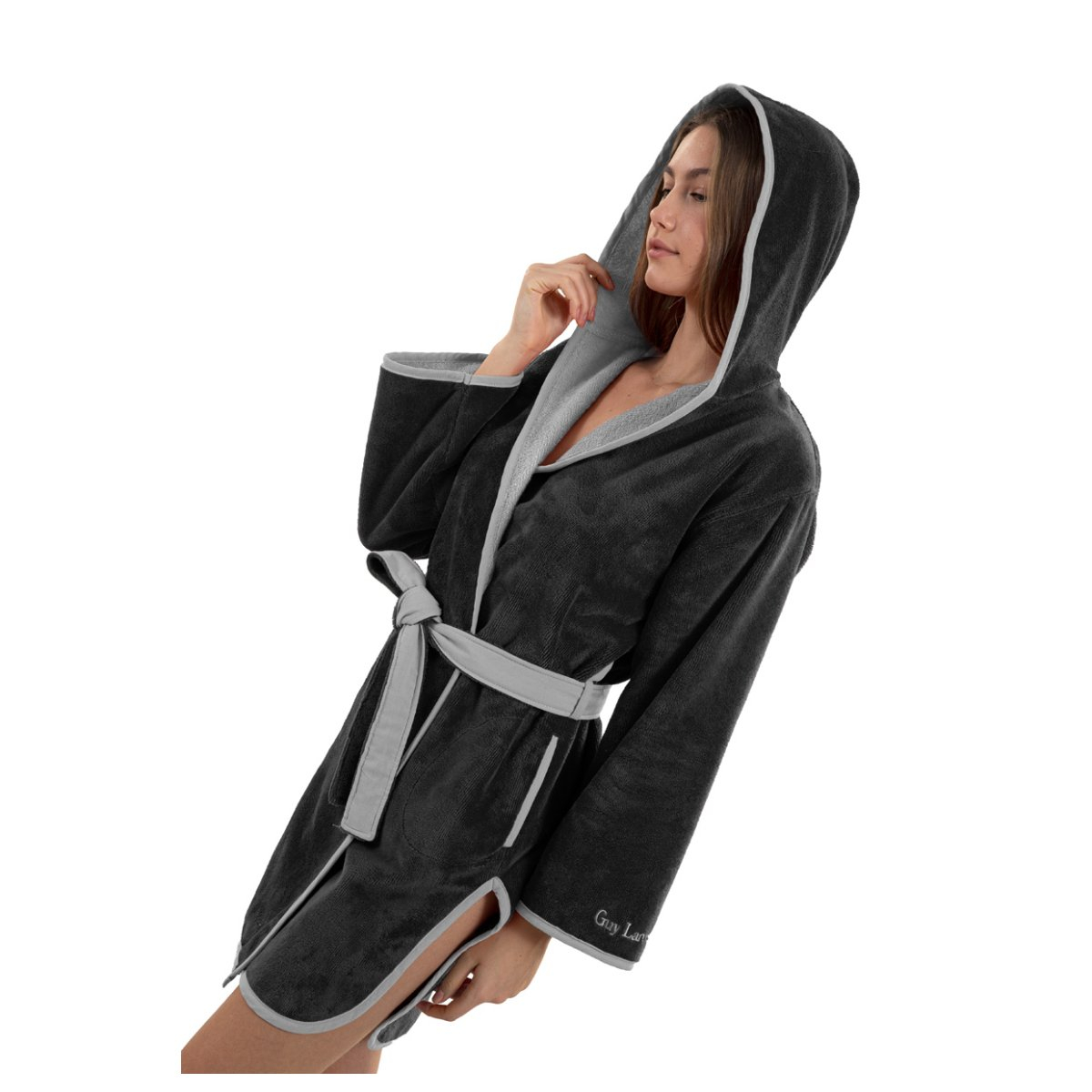 Μπουρνούζι ενηλίκων με κουκούλα σε μαύρο χρώμα από την εταιρεία Guy Laroche. Διαθέτει τσέπες, ζώνη και σκίσιμο στα πλαϊνά. Η εξωτερική όψη είναι βελουτέ από 60% βαμβάκι και 40% polyester ενώ η μέσα πλευρά είναι πετσετέ για να απορροφάει το νερό. Συνδυάστε το με τις πετσέτες μπάνιου 3 τεμαχίων του ίδιου χρώματος για ένα ολοκληρωμένο σετ.