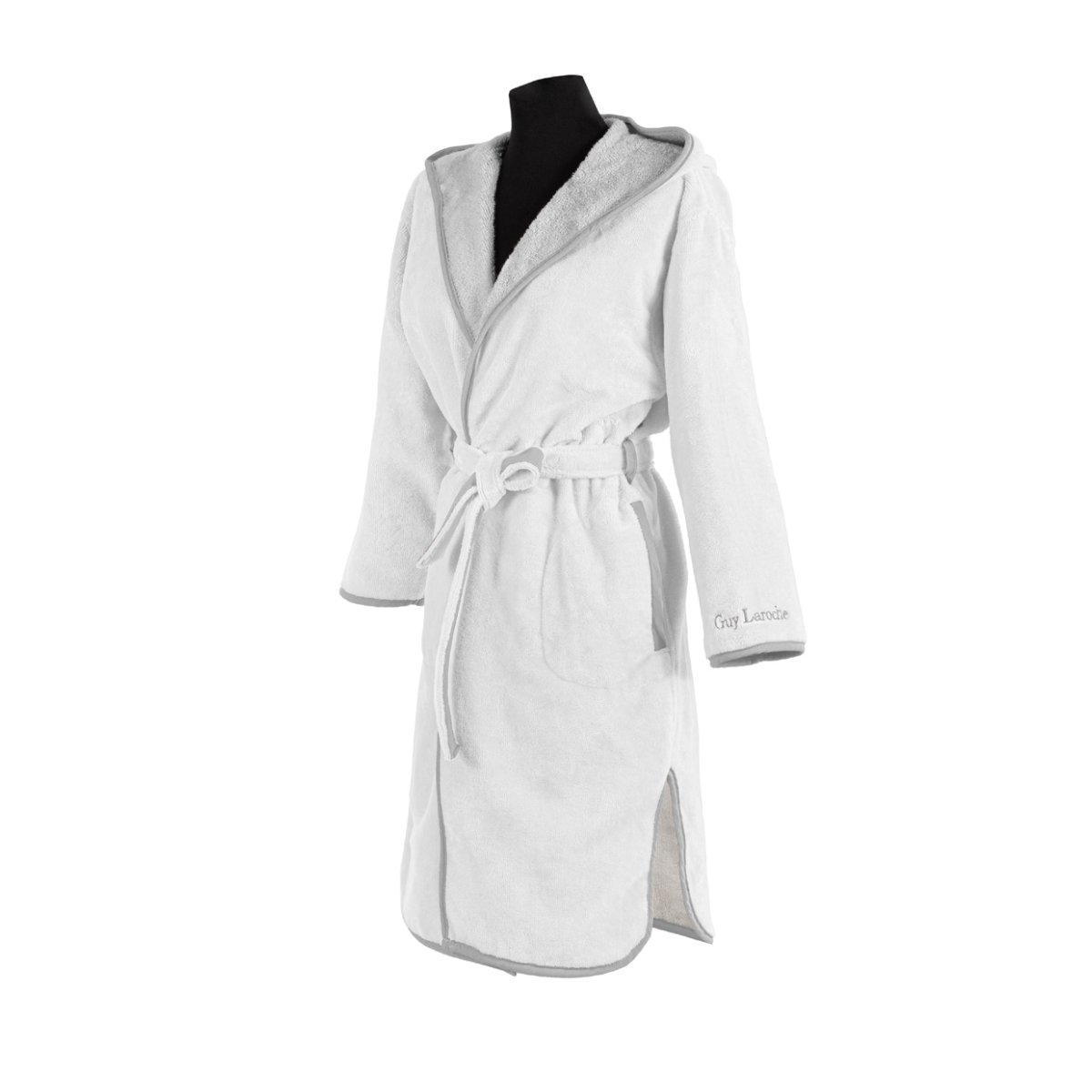 Μπουρνούζι ενηλίκων με κουκούλα σε λευκό χρώμα από την εταιρεία Guy Laroche. Διαθέτει τσέπες, ζώνη και σκίσιμο στα πλαϊνά. Η εξωτερική όψη είναι βελουτέ από 60% βαμβάκι και 40% polyester ενώ η μέσα πλευρά είναι πετσετέ για να απορροφάει το νερό. Συνδυάστε το με τις πετσέτες μπάνιου 3 τεμαχίων του ίδιου χρώματος για ένα ολοκληρωμένο σετ.