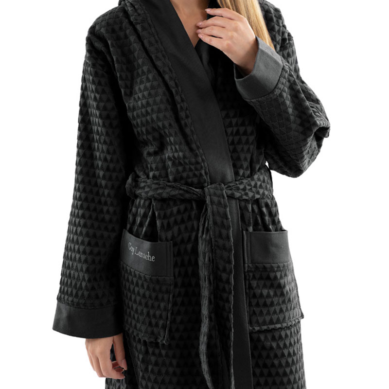 Μπουρνούζι ενηλίκων με κουκούλα σε μαύρο χρώμα και ανάγλυφο γεωμετρικό μοτίβο από την εταιρεία Guy Laroche. Είναι κατασκευασμένο από 100% βαμβάκι που το καθιστά εξαιρετικά απαλό και απορροφητικό.