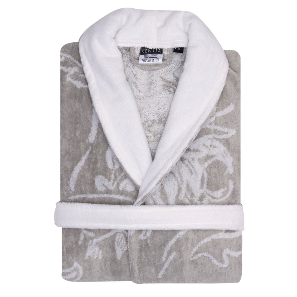 Μπουρνούζι για το μπάνιο σας από την εταιρεία Kentia σε γκρι χρώμα με λευκές λεπτομέρειες και φλοράλ σχέδιο. Έχει βελουτέ υφή και σύνθεση από 100% βαμβάκι βάρους 380gsm που το καθιστά πολύ απορροφητικό. Διαθέτει γιακά και ζώνη. Ιδανικό για το καθημερινό σας μπάνιο
