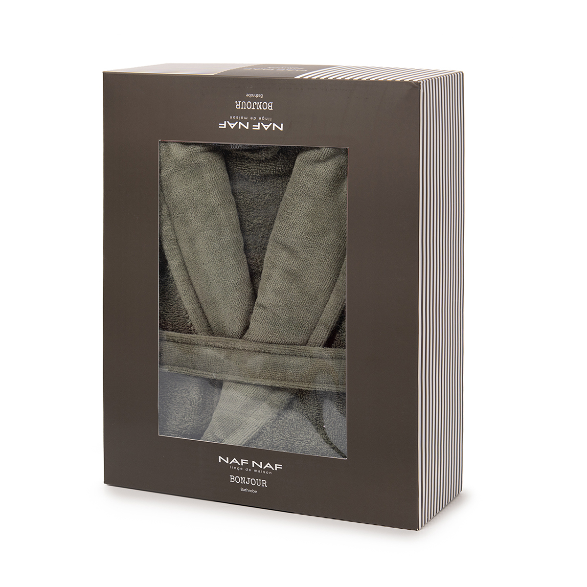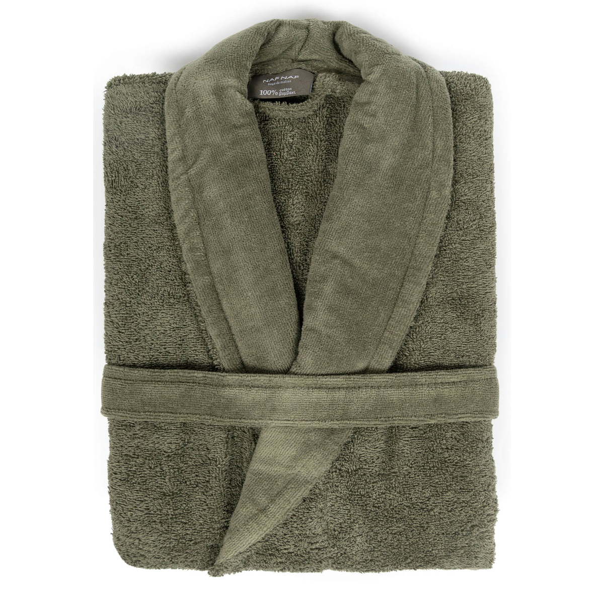 Μπουρνούζι ενηλίκων από την εταιρεία Naf-Naf σε χακί χρώμα. Διαθέτει γιακά, ζώνη και 2 τσέπες. Είναι κατασκευασμένο από 100% βαμβάκι βάρους 450gsm με μεταξένια υφή που προσφέρει απαλότητα και απορροφητικότητα. Ιδανικό μπουρνούζι για το καθημερινό σας μπάνιο. Συσκευασία κουτί.