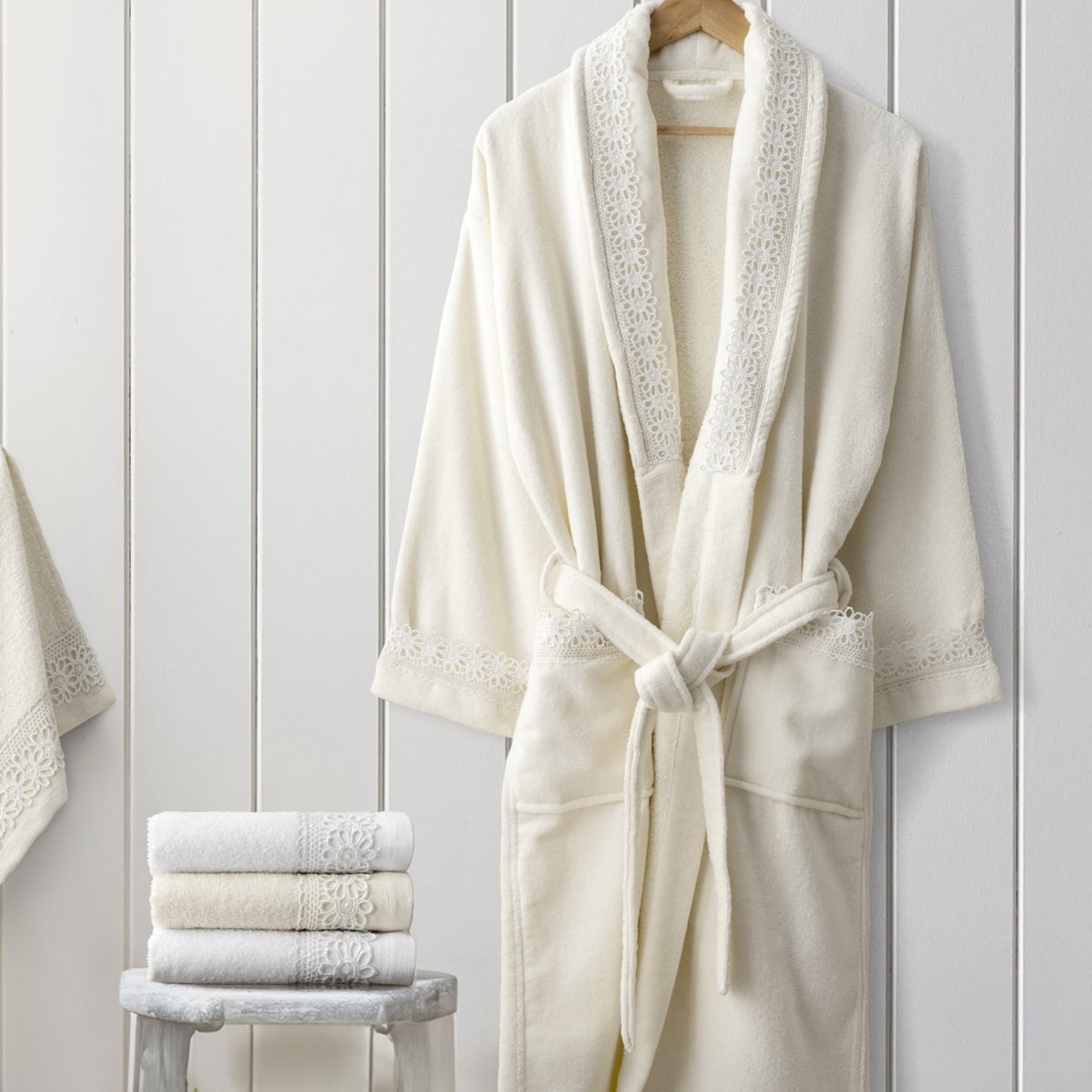 Μπουρνούζι ενηλίκων μπάνιου με γιακά σε λευκό χρώμα και λεπτομέρειες από δαντελωτή φλοράλ λεπτομέρεια από την εταιρεία Nima. Η σύνθεσή του υφάσματος είναι από 100% βαμβάκι 380gsm, που το καθιστά απαλό και απορροφητικό. Το μανίκι είναι 3/4. Ιδανικό μπουρνούζι για το μπάνιο ή το κολυμβητήριο.