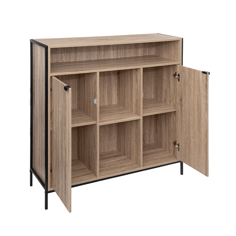 Μπουφές με φυσική όψη ξύλου, μαύρες λεπτομέρειες και μοντέρνο σχεδιασμό. Διαθέτει χώρο για να αποθηκεύσετε τα πράγματά σας. Ιδανικός για το σαλόνι ή για όποιον άλλο χώρο του σπιτιού σας επιθυμείτε. Το προϊόν έρχεται αμοντάριστό και συναρμολογείται βάσει οδηγιών.