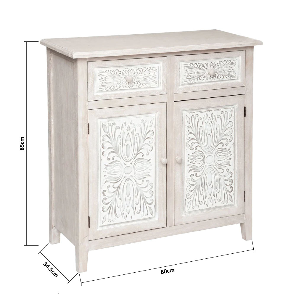 Μπουφές για το σαλόνι ή για όποιον άλλο χώρο του σπιτιού σας επιθυμείτε σε εκρού χρώμα με ανάγλυφο σχέδιο και vintage στυλ. Διαθέτει συρτάρια και ντουλάπια για να αποθηκεύσετε τα πράγματα σας. Το προϊόν έρχεται αμοντάριστό και συναρμολογείται βάσει οδηγιών.