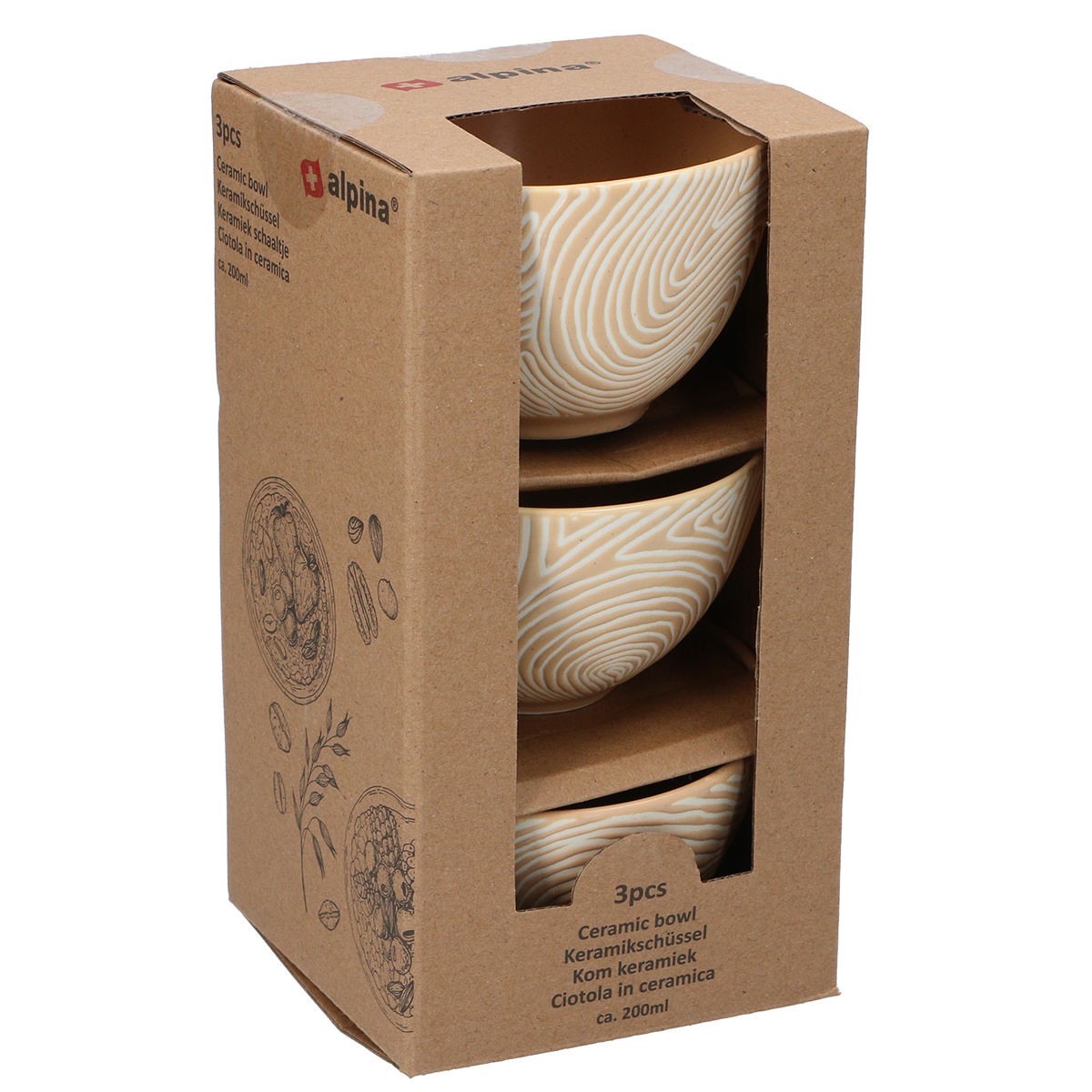 Μπωλ σε σετ από την εταιρεία Alpina. Το σετ περιλαμβάνει 3 μπωλ ίδιου μεγέθους. Είναι κατασκευασμένα από κεραμικό υλικό σε μπεζ χρώμα με λευκό σχέδιο και μοντέρνο ύφος. Ιδανικά μπωλ για το φαγητό σας ή το πρωινό σας. Χωρητικότητα 200ml. Συνδυάστε τα με τα υπόλοιπα είδη του ίδιου σχεδίου για ένα ολοκληρωμένο αποτέλεσμα.