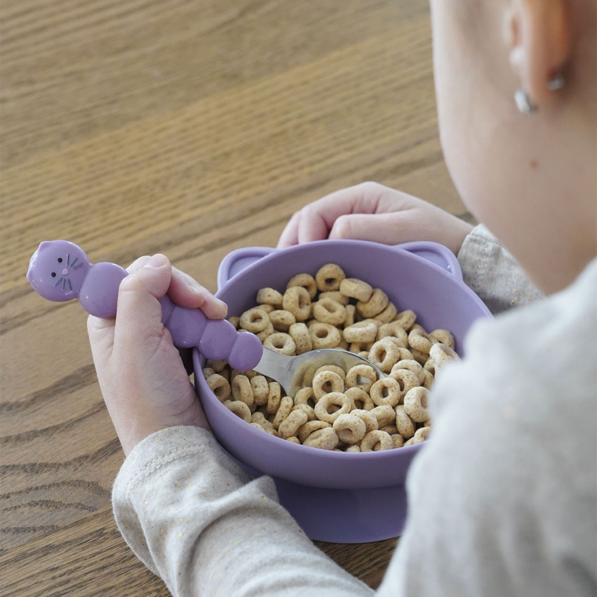 Μπωλ σετ 2 τεμαχίων σε μωβ χρώμα και σχέδιο γατούλα από την εταιρεία Melii. Είναι κατασκευασμένα από υψηλής ποιότητας σιλικόνη 100% κατάλληλη για τρόφιμα. Πρόκειται για 100% μη τοξικά προϊόντα χωρίς BPA, PVC, κάδμιο και μόλυβδο. Διαθέτουν βεντούζα στο κάτω μέρος για να παραμένουν σταθερά και να αποτρέπουν τυχόν αναποδογυρίσματα και πτώσεις. Είναι κατάλληλα για ζεστές και κρύες τροφές. Πλένονται στο πλυντήριο πιάτων και μπαίνουν στο φούρνο μικροκυμάτων.