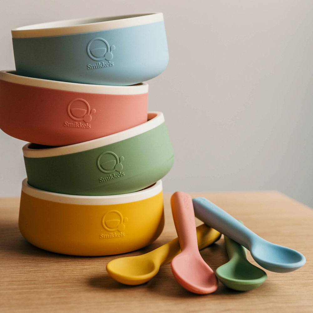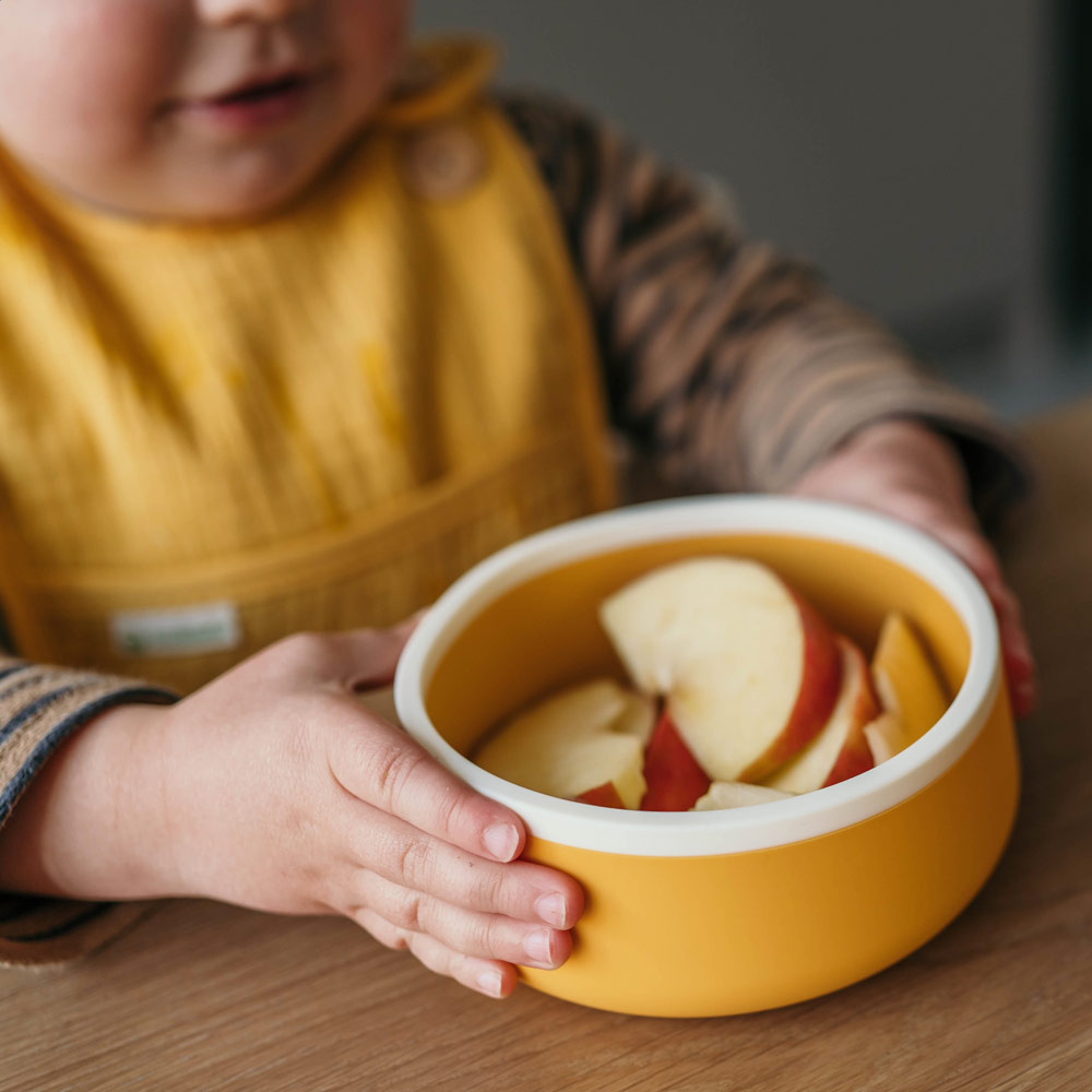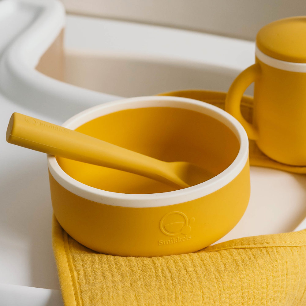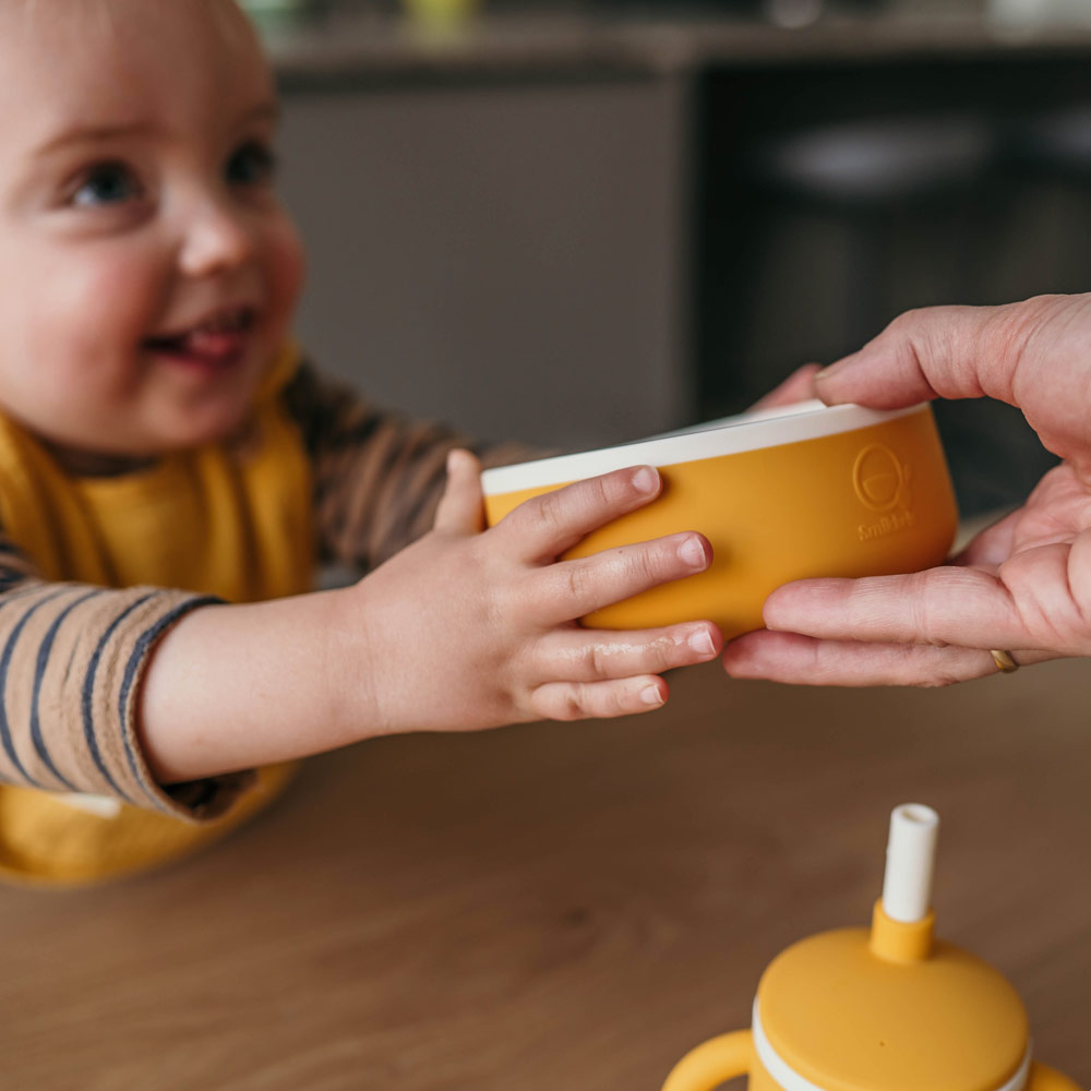 Μπολ φαγητού από την εταιρεία Smikkels σε κίτρινο χρώμα με λευκό χείλος. Είναι κατασκευασμένο από σιλικόνη απαλλαγμένη από BPA. Η σιλικόνη αποτελεί ένα πολύ αντιολισθητικό υλικό, έτσι ώστε να μην γλιστράει από το τραπέζι ή τα χέρια κατά τη διάρκεια του φαγητού. Είναι άθραυστο και παρέχει σταθερότητα. Είναι κατάλληλο τόσο για ζεστό όσο και για κρύο φαγητό.