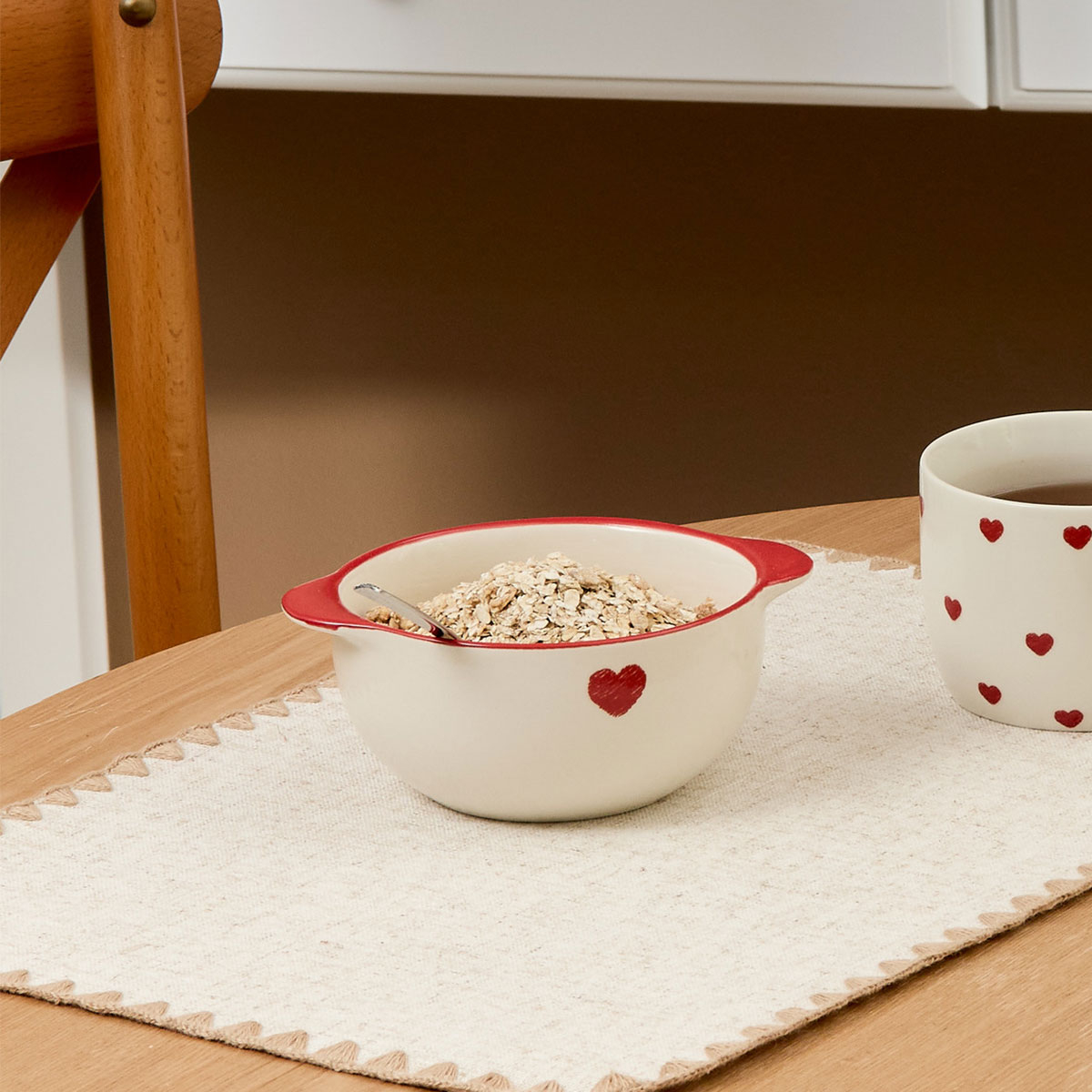Μπωλ 430ml σε εκρού χρώμα με κόκκινες λεπτομέρειες και σχέδιο καρδιά. Είναι κατασκευασμένο από ποιοτικό κεραμικό υλικό τύπου πορσελάνης το οποίο αποτελεί και μια πιο σύγχρονη, οικολογική εναλλακτική της παραδοσιακής πορσελάνης. Ιδανικό για δημητριακά, φρούτα, κρέμες και ότι άλλο επιθυμείτε. Συνδυάστε το με τα υπόλοιπα προϊόντα του ίδιου σχεδίου για ένα ολοκληρωμένο αποτέλεσμα.