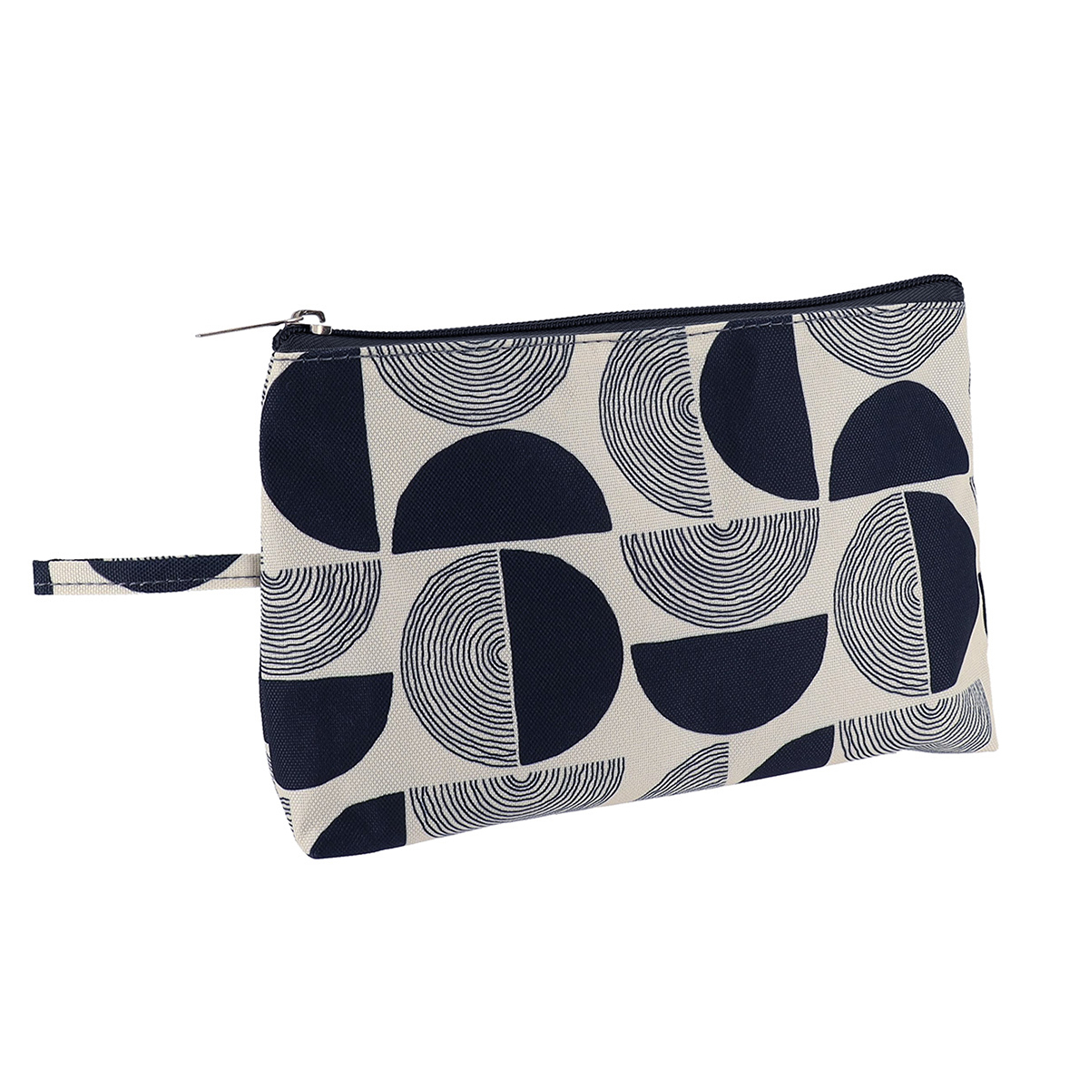Νεσεσέρ τσάντας σε λευκό χρώμα με μαύρο γεωμετρικό σχέδιο. Είναι υφασμάτινο και κατασκευασμένο από 100% polyester. Ιδανικό για να αποθηκεύετε όλα τα απαραίτητα είδη μακιγιάζ, τα καλλυντικά και άλλα προϊόντα ομορφιάς στο σπίτι ή όταν ταξιδεύετε. Διαθέτει θηλάκι για εύκολη μεταφορά και κλείνει με φερμουάρ. Πολύ πρακτικό αξεσουάρ για να το παίρνετε παντού μαζί σας. Συνδυάστε το με τα υπόλοιπα είδη της συλλογής για ένα ολοκληρωμένο αποτέλεσμα.