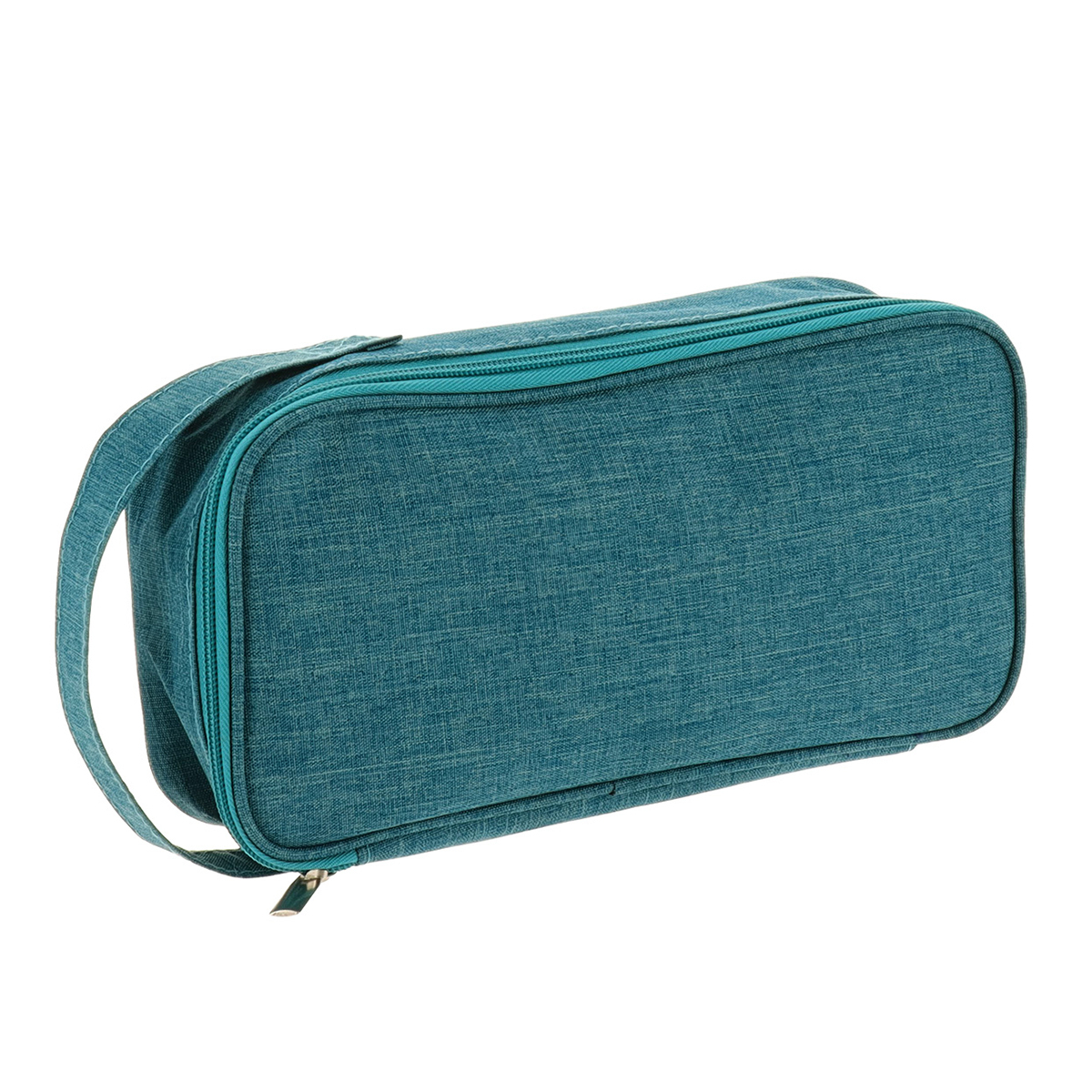Νεσεσέρ ταξιδίου σε πετρόλ χρώμα με μοντέρνο σχεδιασμό. Είναι υφασμάτινο, κατασκευασμένο από 100% polyester και έχει ορθογώνιο σχήμα. Έχει ένα μεγάλο χώρο αποθήκευσης στο εσωτερικό του και 2 θηκάκια. Διαθέτει λαβή για εύκολη μεταφορά και κλείνει με φερμουάρ. Πολύ πρακτικό αξεσουάρ για να το παίρνετε παντού μαζί σας. Συνδυάστε το με τα υπόλοιπα είδη της συλλογής για ένα ολοκληρωμένο αποτέλεσμα.