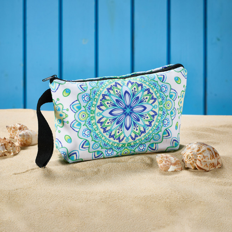 Τσαντάκι θαλάσσης από την εταιρεία Whitegg, σε λευκό φόντο με πράσινο-μπλε έθνικ σχέδιο. Είναι κατασκευασμένο από 100% πολυεστέρα. Κλείνει με φερμουάρ και διαθέτει λουράκι για να το έχετε μαζί σας παντού. Ιδανικό νεσεσέρ για να μεταφέρετε μικροαντικείμενα εύκολα όπου εσείς επιθυμείτε.