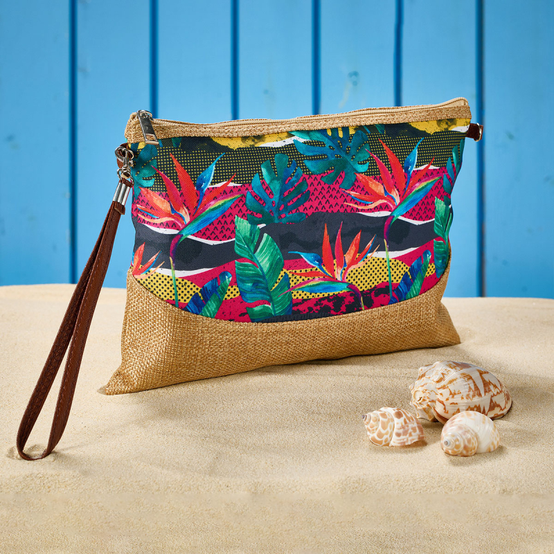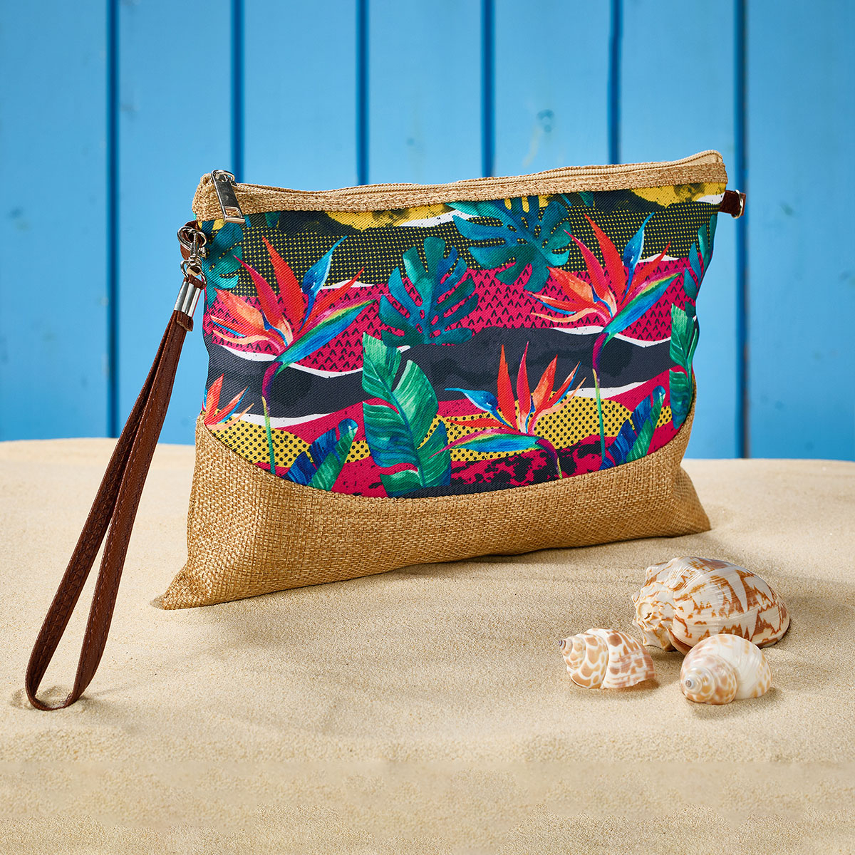 Τσαντάκι θαλάσσης από την εταιρεία Whitegg, με πολύχρωμο τρόπικαλ σχέδιο. Είναι κατασκευασμένο από 100% πολυεστέρα. Διαθέτει ψάθινα στοιχεία. Κλείνει με φερμουάρ και διαθέτει λουράκι για να το έχετε μαζί σας παντού. Ιδανικό νεσεσέρ για να μεταφέρετε μικροαντικείμενα εύκολα όπου εσείς επιθυμείτε.
