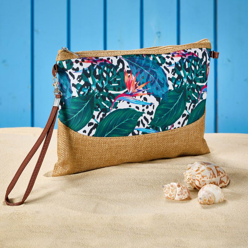 Τσαντάκι θαλάσσης από την εταιρεία Whitegg, με πράσινο τρόπικαλ σχέδιο. Είναι κατασκευασμένο από 100% πολυεστέρα. Διαθέτει ψάθινα στοιχεία. Κλείνει με φερμουάρ και διαθέτει λουράκι για να το έχετε μαζί σας παντού. Ιδανικό νεσεσέρ για να μεταφέρετε μικροαντικείμενα εύκολα όπου εσείς επιθυμείτε.