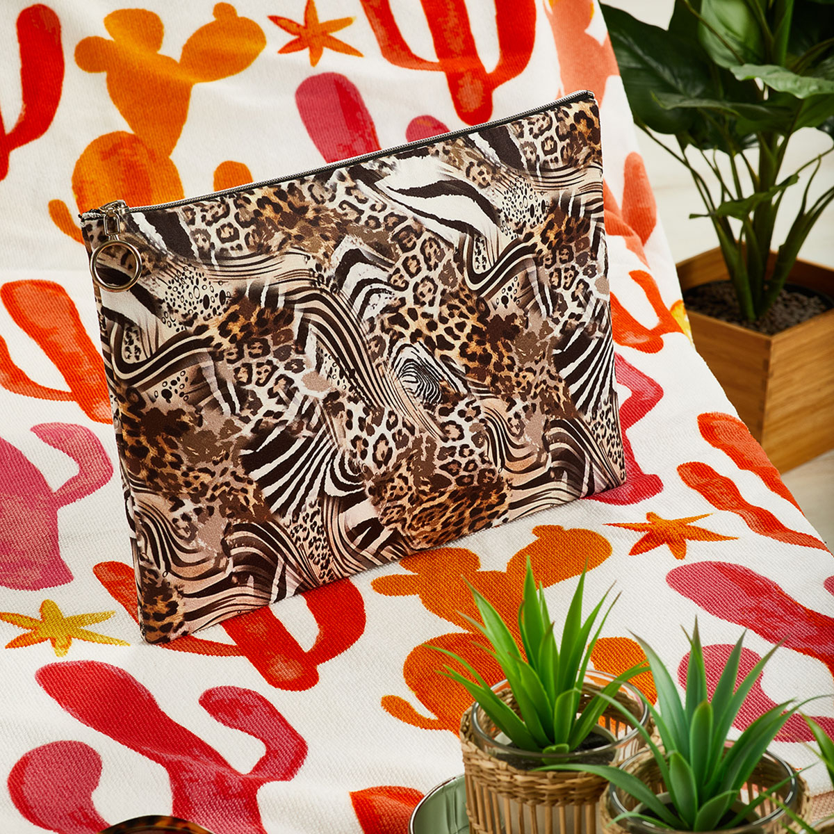 Τσαντάκι θαλάσσης σε καφέ χρώμα, με λευκές-μπεζ λεπτομέρειες και animal print σχέδιο από την εταιρεία Whitegg. Είναι κατασκευασμένο από 100% polyester. Κλείνει με φερμουάρ για να το έχετε μαζί σας παντού. Ιδανικό νεσεσέρ για να μεταφέρετε μικροαντικείμενα εύκολα και χωρίς ογκώδεις τσάντες.