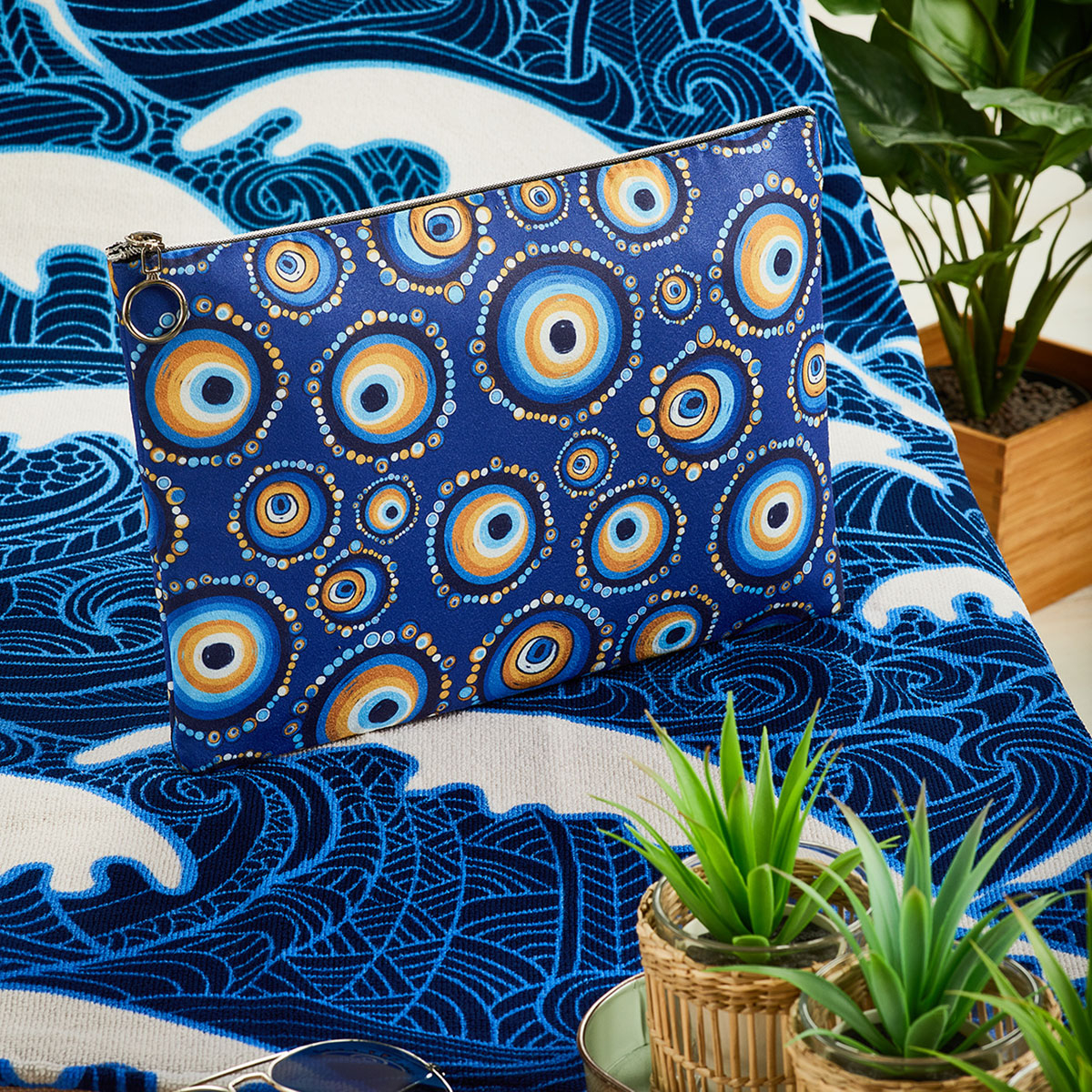 Τσαντάκι θαλάσσης σε μπλε χρώμα, με εκρού-ώχρα λεπτομέρειες και μοντέρνο σχέδιο από την εταιρεία Whitegg. Είναι κατασκευασμένο από 100% polyester. Κλείνει με φερμουάρ για να το έχετε μαζί σας παντού. Ιδανικό νεσεσέρ για να μεταφέρετε μικροαντικείμενα εύκολα και χωρίς ογκώδεις τσάντες.