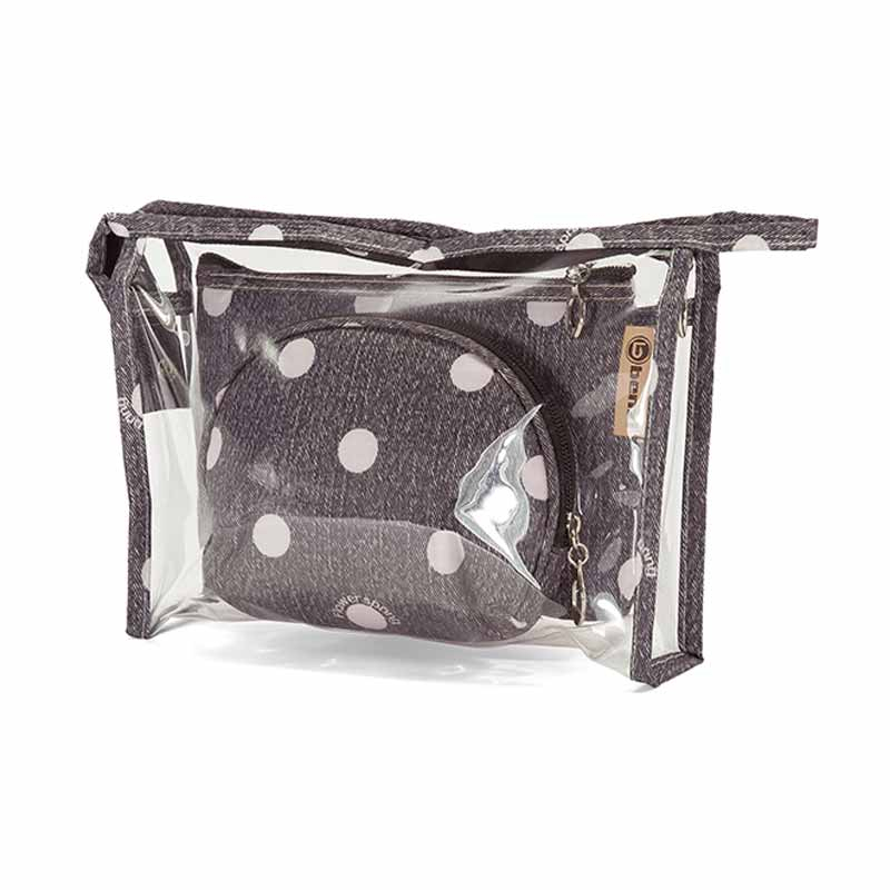 Σετ νεσεσέρ από την εταιρεία Benzi. Είναι απαραίτητα για να οργανώσετε τα πράγματά σας στην τσάντα παραλίας, στην βαλίτσα, στο ντουλάπι, κλπ. Είναι κατασκευασμένα από ύφασμα polyester και πλαστικό PVC. Το μεγάλο είναι διάφανο και τα μικρότερα έχουν πουά σχέδιο σε μαύρο-γκρι χρώμα. Κλείνουν με φερμουάρ.