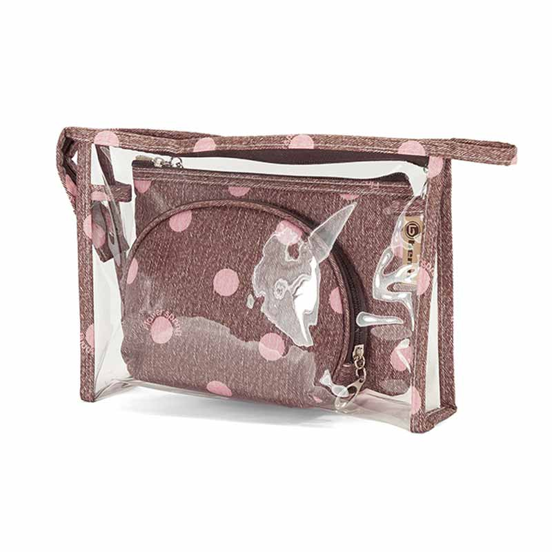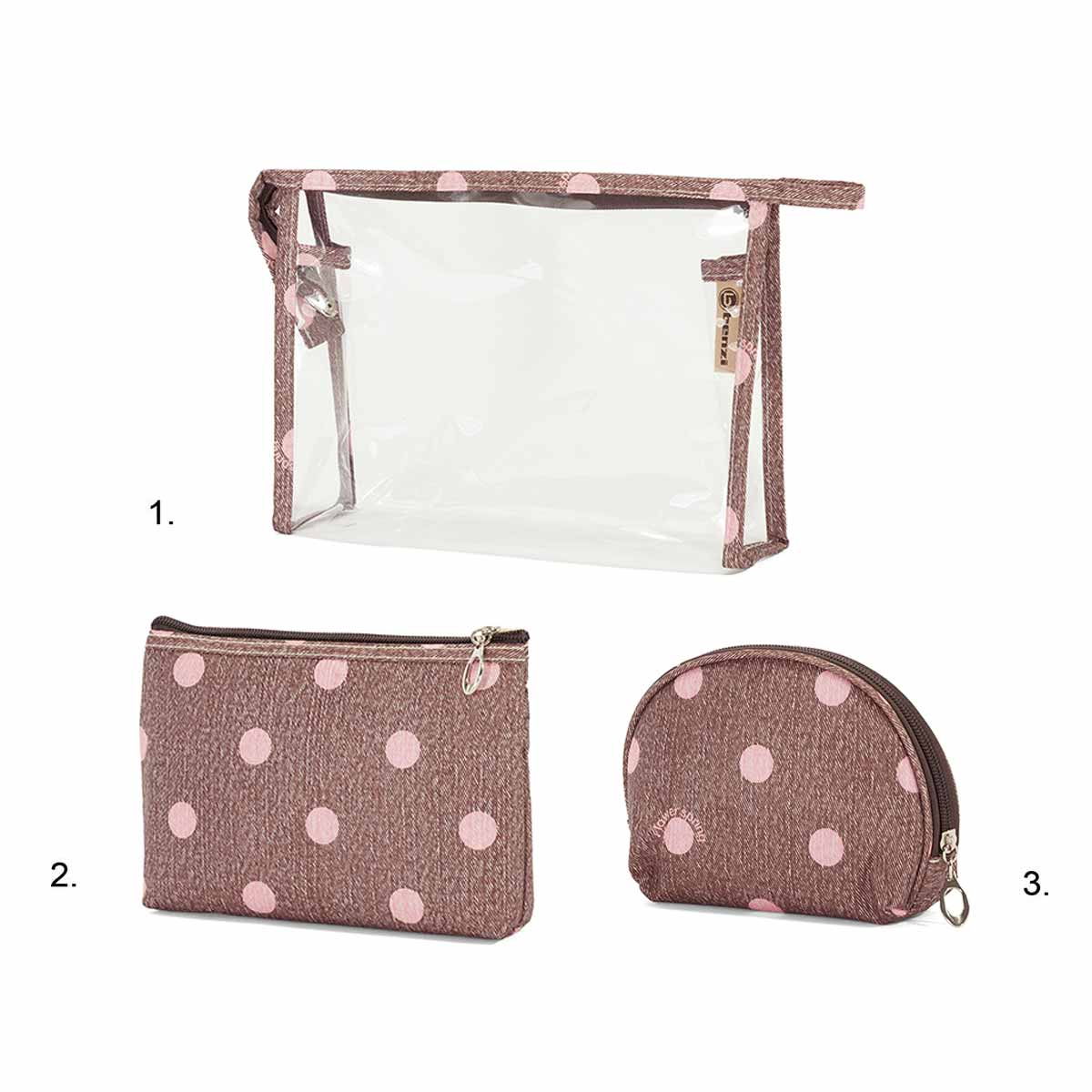 Σετ νεσεσέρ από την εταιρεία Benzi. Είναι απαραίτητα για να οργανώσετε τα πράγματά σας στην τσάντα παραλίας, στην βαλίτσα, στο ντουλάπι, κλπ. Είναι κατασκευασμένα από ύφασμα polyester και πλαστικό PVC. Το μεγάλο είναι διάφανο και τα μικρότερα έχουν πουά σχέδιο σε καφέ-ροζ χρώμα. Κλείνουν με φερμουάρ.
