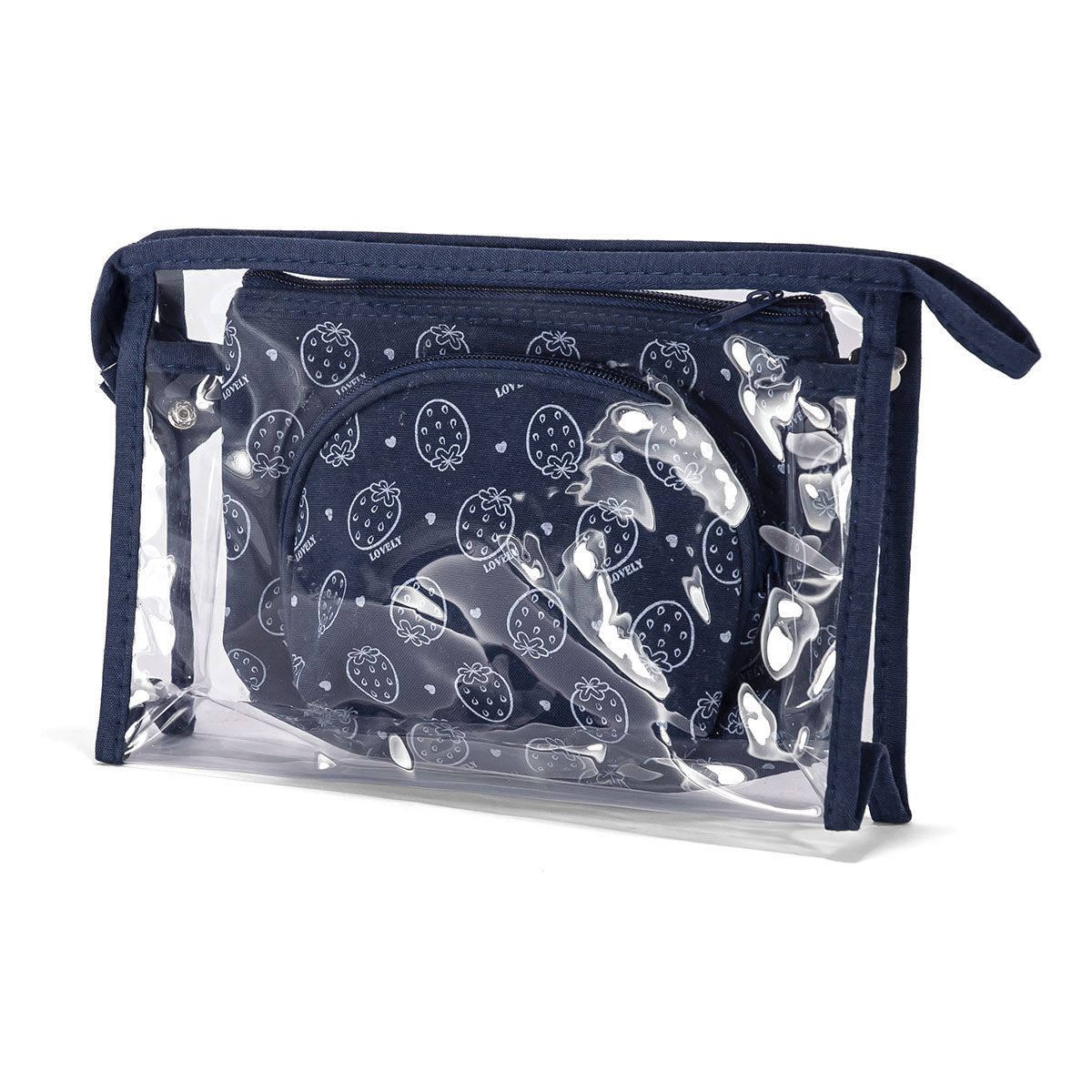 Σετ νεσεσέρ από την εταιρεία Benzi. Είναι κατασκευασμένα από ύφασμα polyester και πλαστικό PVC. Το μεγάλο είναι διάφανο και τα μικρότερα έχουν μπλε χρώμα με λευκές λεπτομέρειες και μοντέρνο σχέδιο. Κλείνουν με φερμουάρ. Το ένα μπαίνει μέσα στο άλλο για εύκολη αποθήκευση όταν δεν χρησιμοποιούνται. Είναι ιδανικά για να οργανώσετε τα πράγματά σας στην τσάντα παραλίας, στην βαλίτσα, στο ντουλάπι, κλπ.