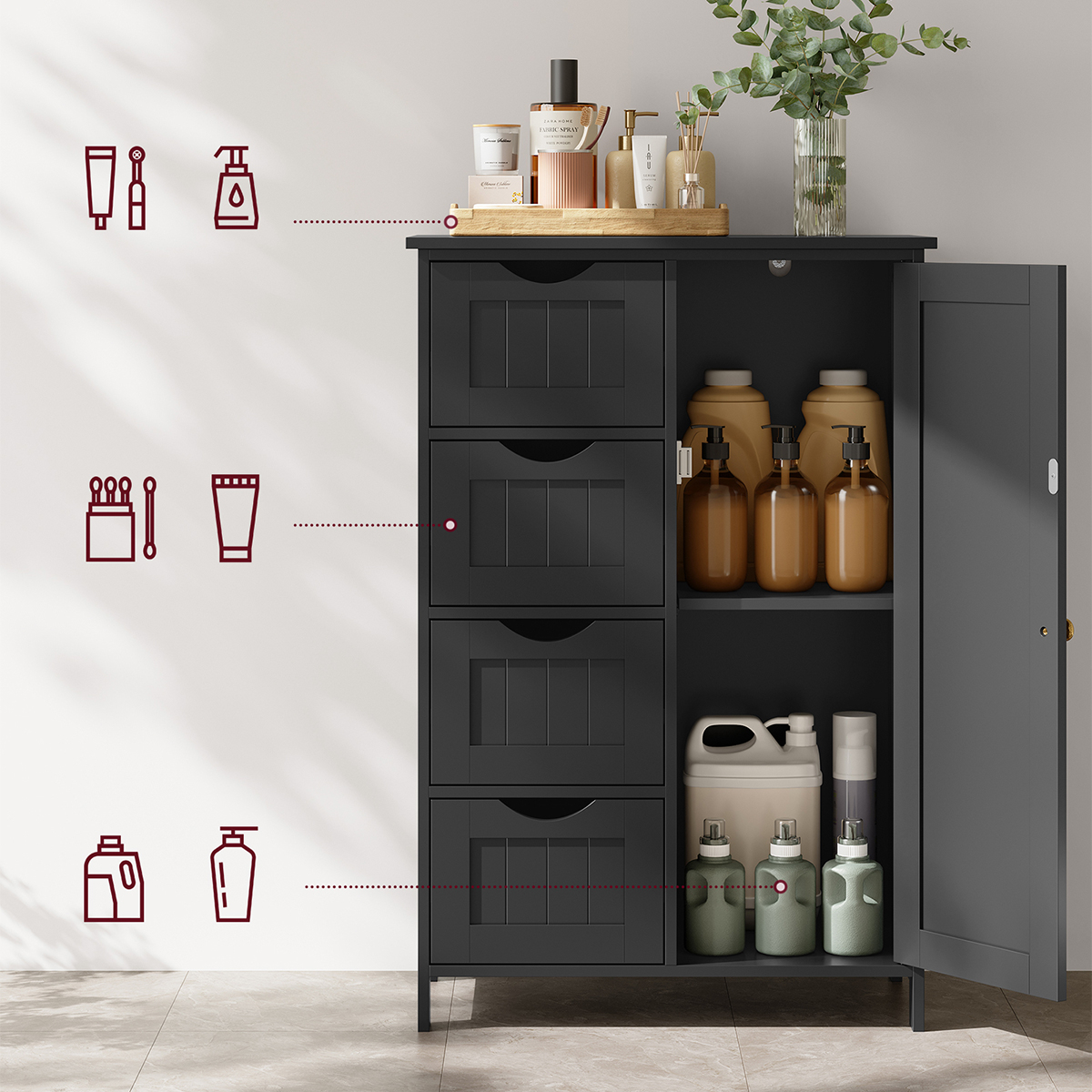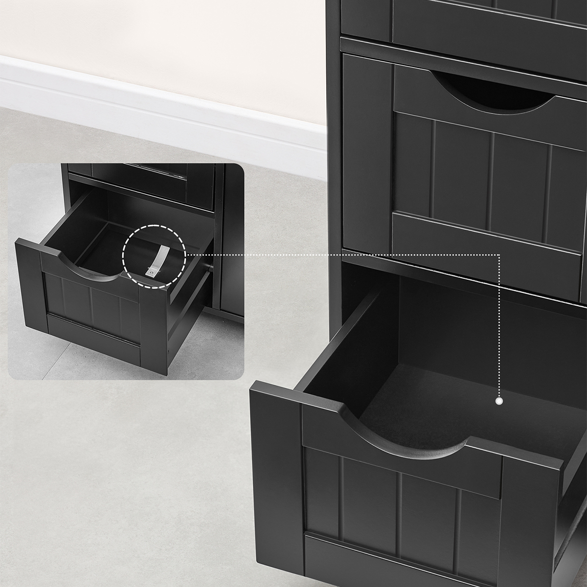 Επιδαπέδιο ντουλάπι με μοντέρνο σχεδιασμό σε μαύρο χρώμα από την εταιρεία Vasagle. Διαθέτει συρτάρια και εσωτερικό ράφι με 3 πιθανές θέσεις εγκατάστασης για να το βάλετε σε όποιο ύψος σας βολεύει. Ιδανικό για να το τοποθετήσετε στο μπάνιο, στο σαλόνι ή όπου αλλού θέλετε. Το προϊόν έρχεται αμοντάριστο και συναρμολογείται βάσει οδηγιών.
